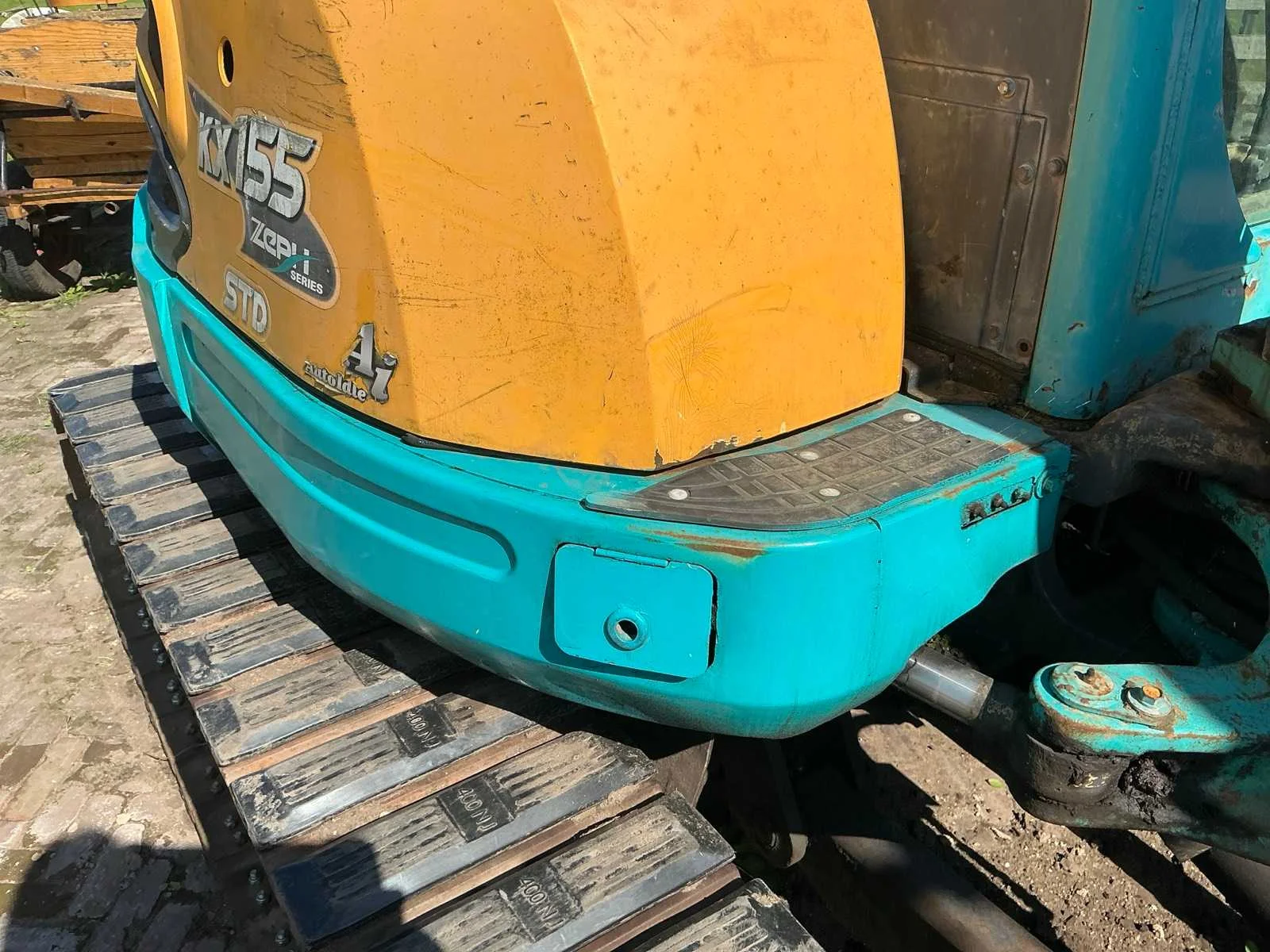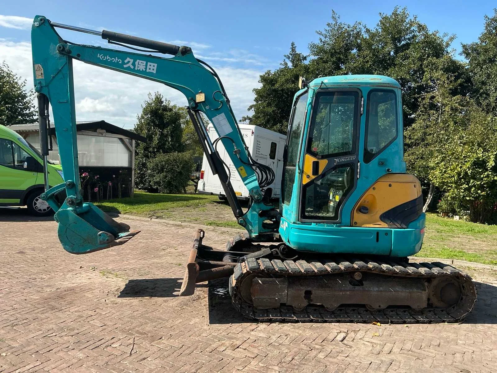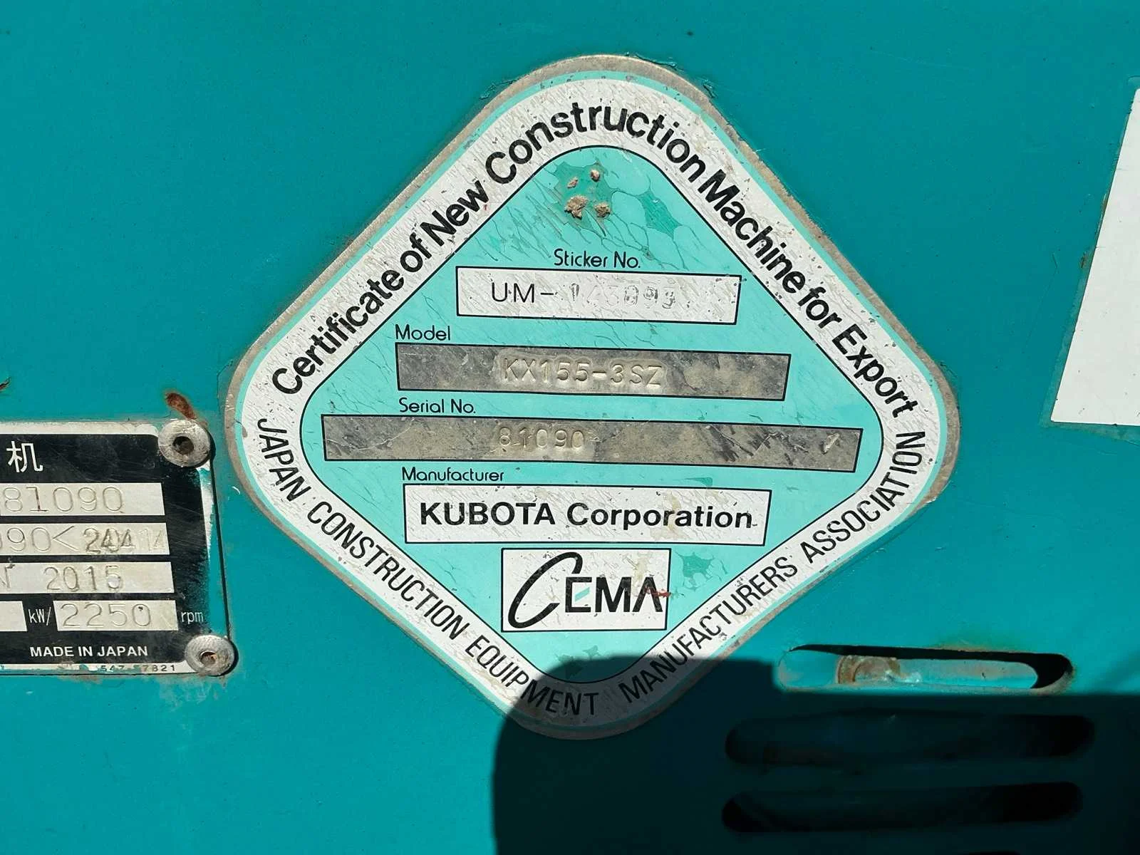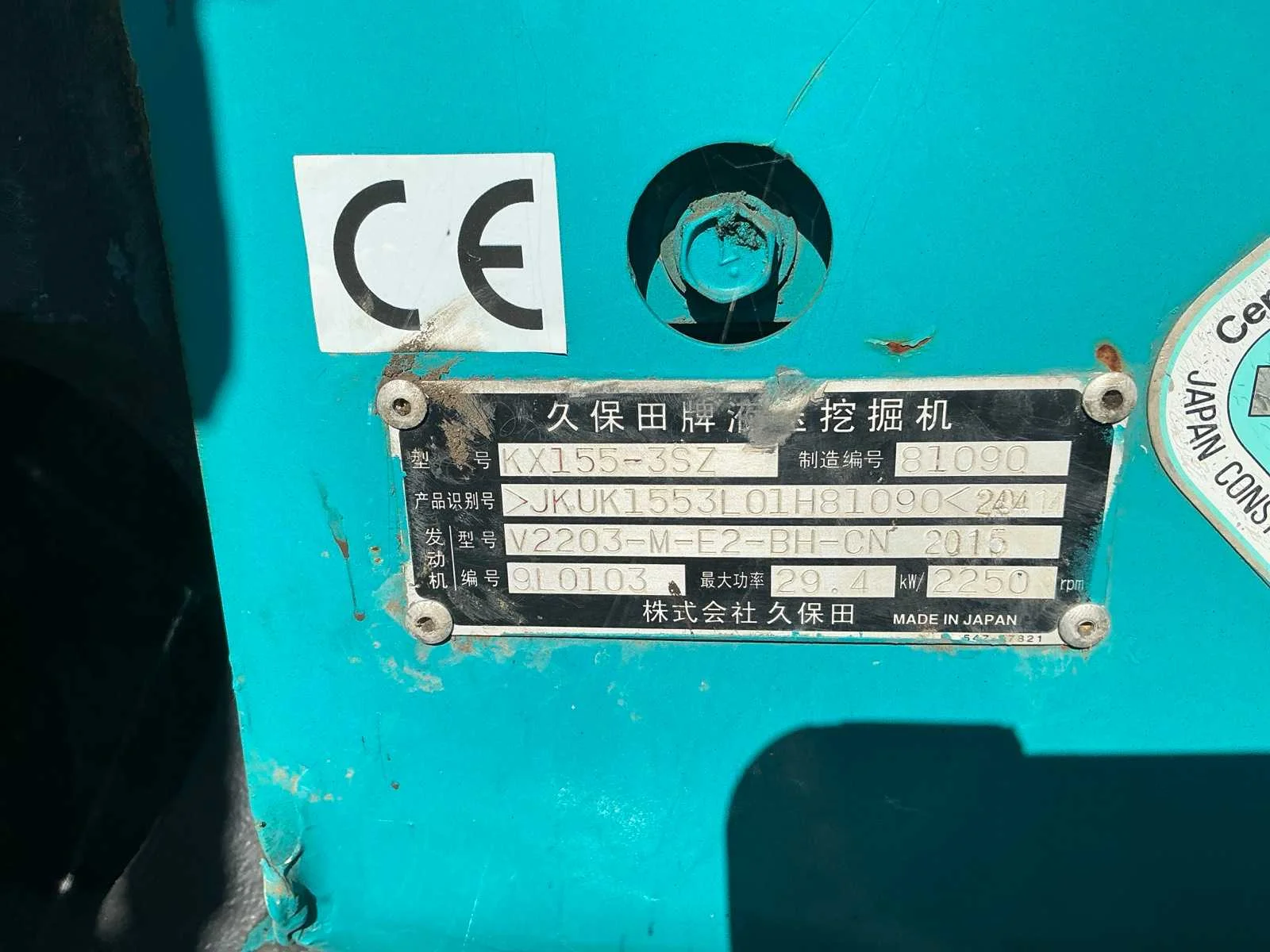 Voorzien van: zandschep, werkverlichting, radio No Merk: Kubota Type: KX155-3SZ Bouwjaar: 2015 Serienummer: 81090 Motorvermogen (kW): 29.4kW Brandstof: Diesel Bedrijfsgewicht: 5115kg Gieklengte: 2000mm Max. werkbereik: 5600mm Max. graafdiepte: 3560mm Met graafbak: true Graafbak afm. l: 700mm Graafbak afm. b: 750mm Rups breedte: 400mm Cabine: true Afgelezen urenstand: 7636 Totale afmeting L: 3800mm Totale afmeting Breedte: 2000mm Totale afmeting Hoogte: 2530mm