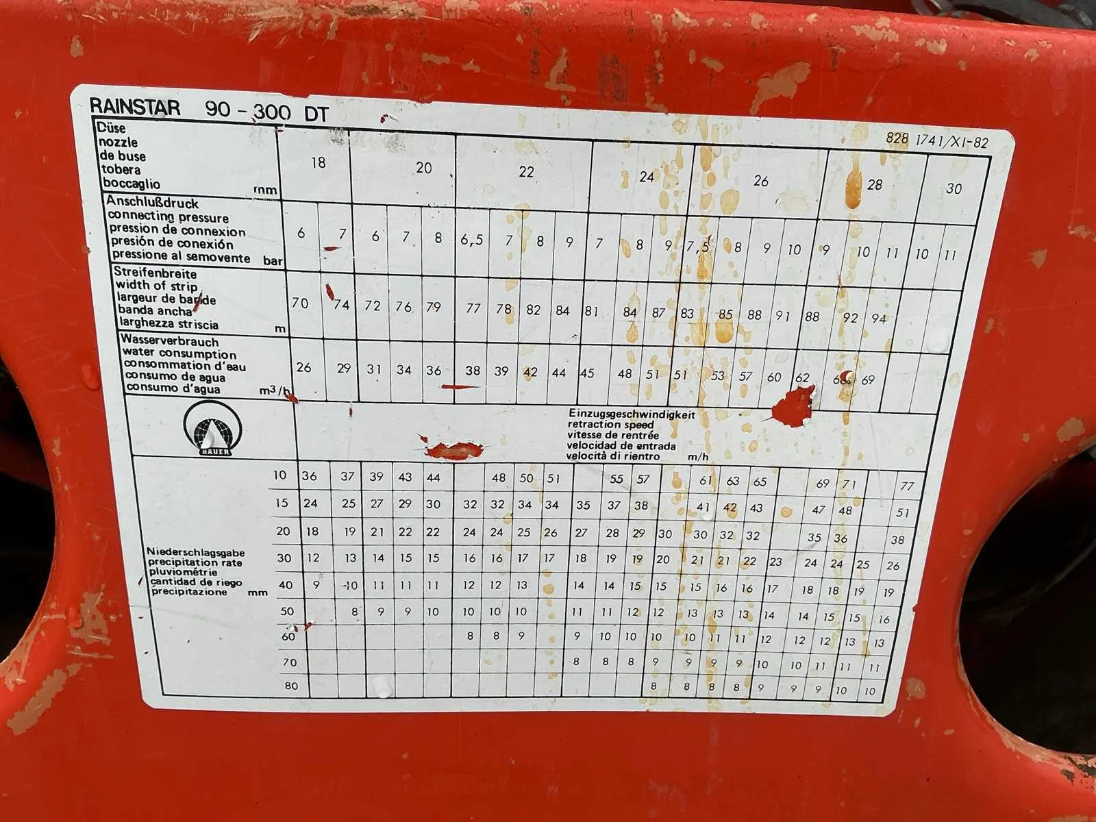 Voorzien van: steunpoten, beregenings computer irrigamatic 300, sproeiwagen, sproeikanon, 3 extra nozzels, slang 90mm, 265mtr lang, gebruikershandleiding. Nee Merk: Bauer Lengte: 265000cm Type: Rainstar 90-300 Serienummer: 0109570 Diameter circa: 90mm Steunpoten: true Totale afmeting L: 5400mm Totale afmeting Breedte: 2300mm Totale afmeting Hoogte: 3000mm