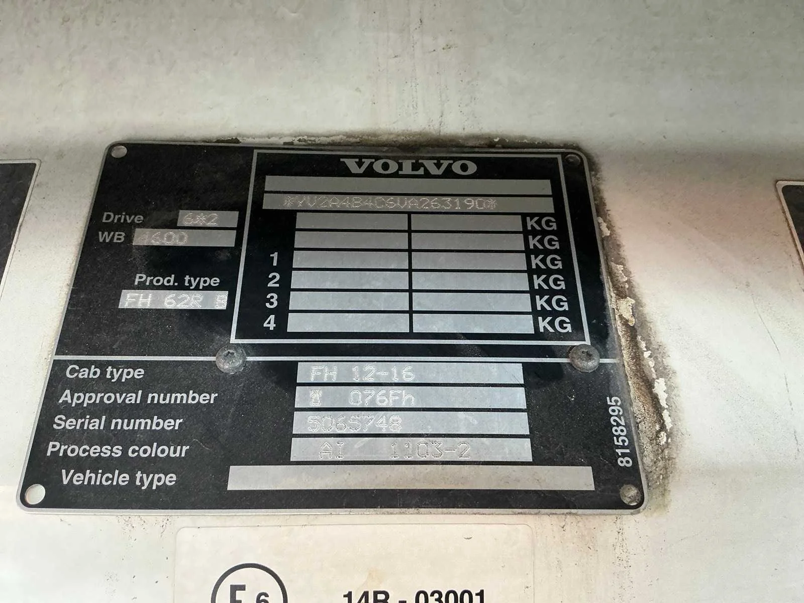 Voorzien van: handgeschakelde versnellingsbak, xl cabine, luchtgeveerde vooras, retarder, vangmuil Nee Merk: Volvo Type: FH16 Bouwjaar: 1997 Chassisnummer VIN: YV2A4B4C6VA263190 Kilometerstand bij opname: 5223375km Type transmissie: Handgeschakeld Aantal assen: 3 Asconfiguratie: 6x2 Fuel Type: Diesel Aantal sleutels: 1 Slaapcabine: true Aantal zitplaatsen: 2 Handgeschakelde versnellingsbak: true Diesel: true