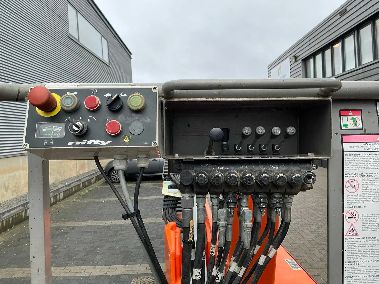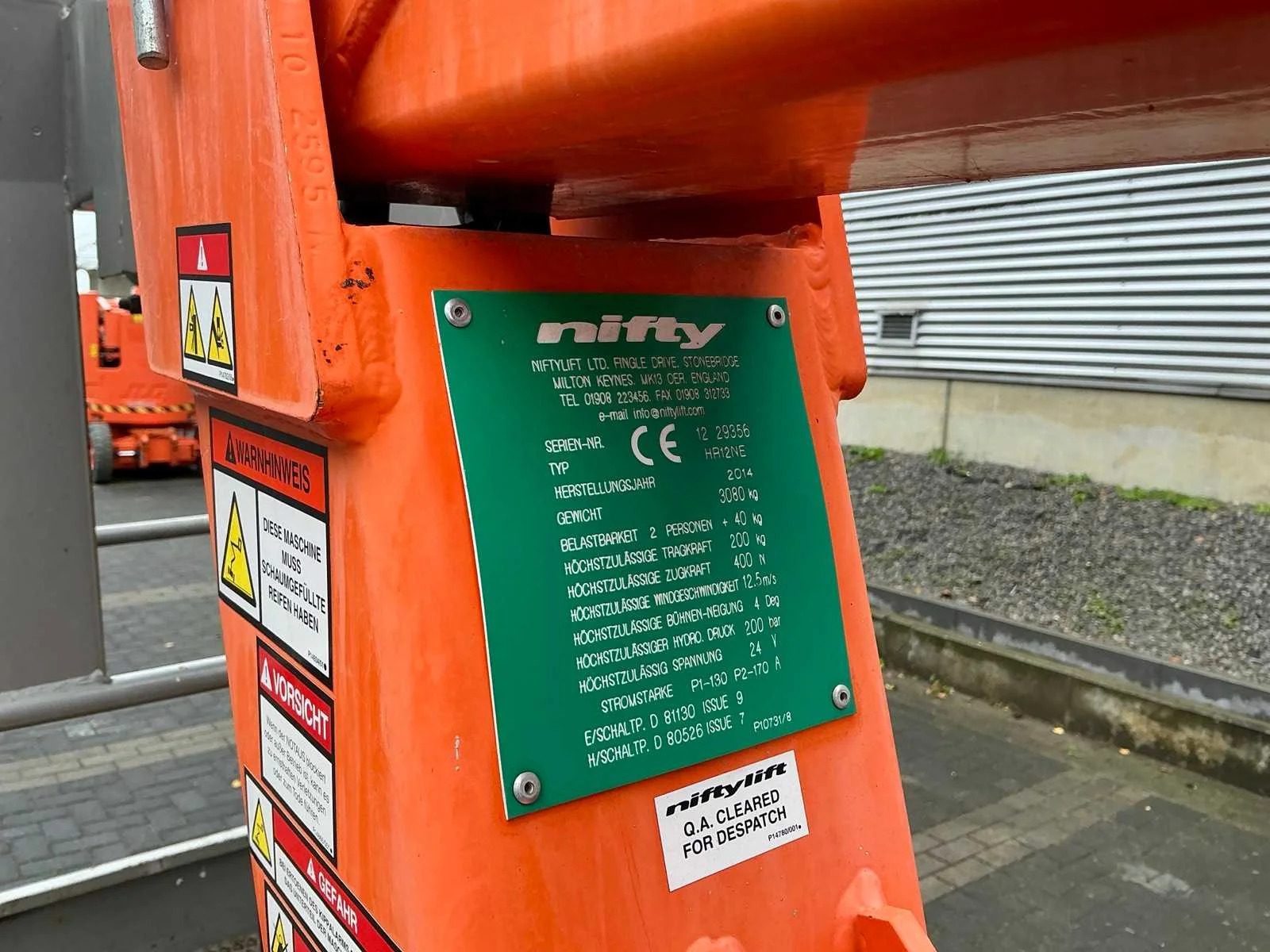 Voorzien van: Werkbereik 6400mm, platformhoogte 1010mm, breedte machine 1490mm, hoogte machine 1980mm, lengte machine 3970mm, rijsnelheid 6km/h, hellingsgraad 25% / 14°, draairadius 3300mm, veilige werkbelasting 200kg, kooibreedte 1200mm, kooidiepte 850mm, onderhoudsvrije accu’s, proportionele multifunctionele bediening. Nee Merk: Nifty Type: HR 12NE Bouwjaar: 2014 Serienummer: 12 29356 Elektrisch: true Knikarm hoogwerker: true Werkhoogte: 6400mm Plateau afm. l: 950mm Plateau afm. b: 660mm Platform capaciteit: 200kg Accu lader: true Eigen gewicht: 3080kg