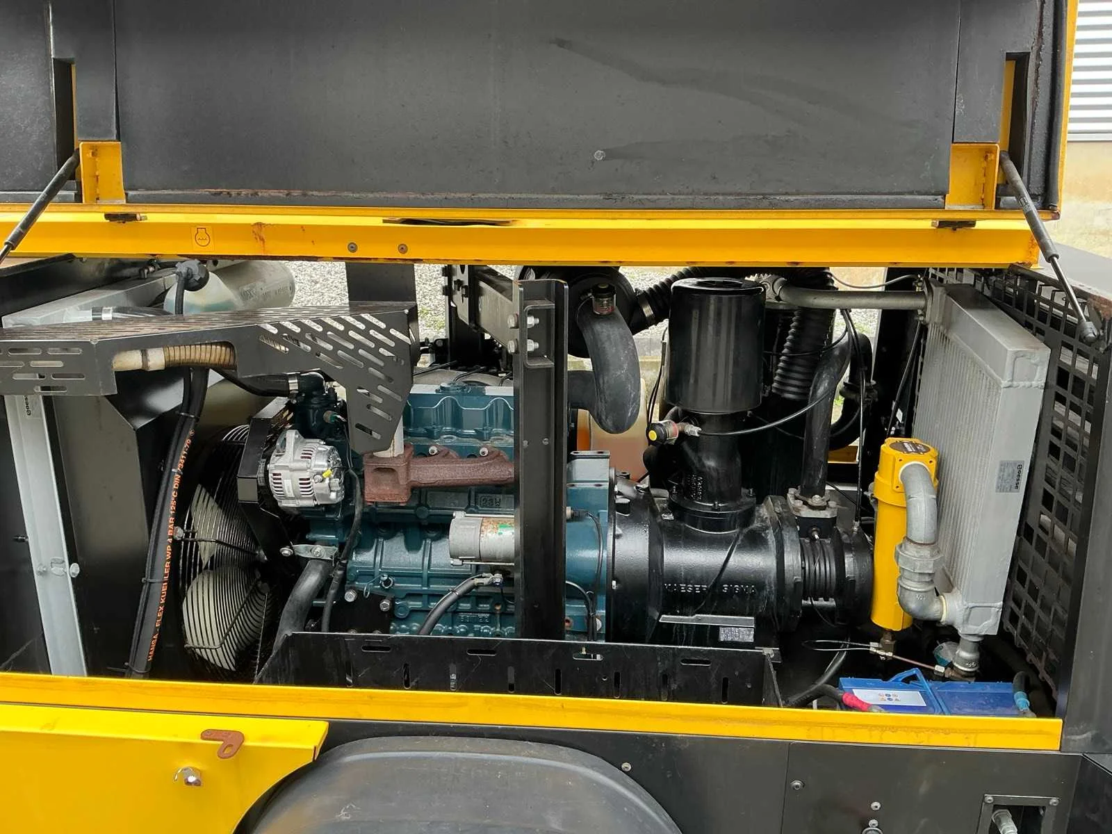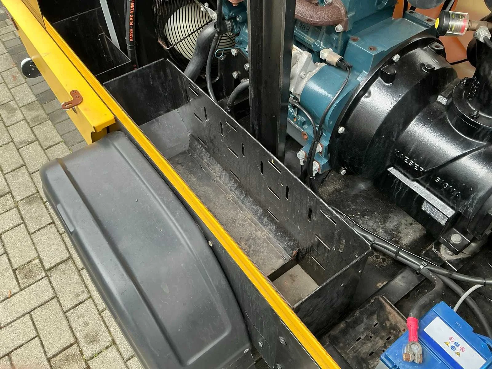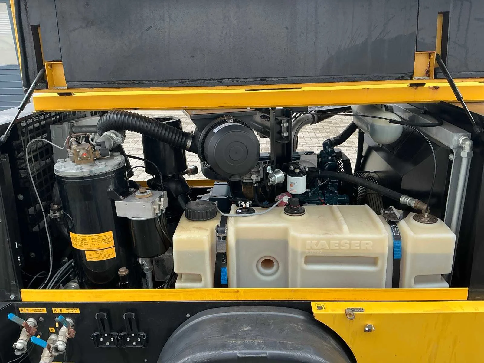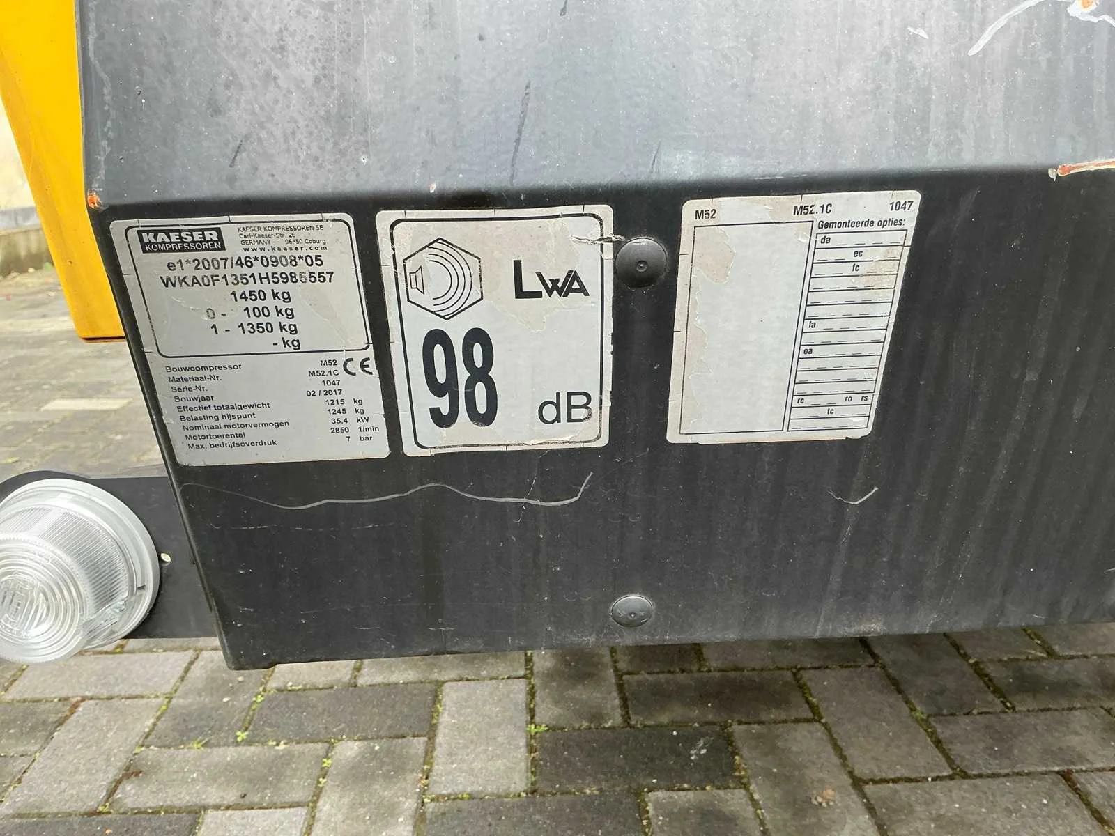 Voorzien van: Kubota V2203, 4 cilinder diesel, lucht na-koeler, snel-koppeling naar brandstof tank, verlichting, hoofdschakelaar, neuswiel, handrem, oplooprem, opbrengst: 5,2 m³/min, max. werkdruk: 7 bar, brandstoftankinhoud: 105 l, bedrijfsgewicht: 1225 kg, luchtaansluiting: 2 x G ¾, 1 x G 1. Nee Merk: Kaeser Type: M52.1C Bouwjaar: 2017 Serienummer: 1047 Capaciteit.: 7bar Luchtstroom: 2850l/min Vermogen: 35.4kW Afgelezen urenstand: 2052 Eigen gewicht: 1215kg Totale afmeting L: 4000mm Totale afmeting Breedte: 1700mm Totale afmeting Hoogte: 1400mm