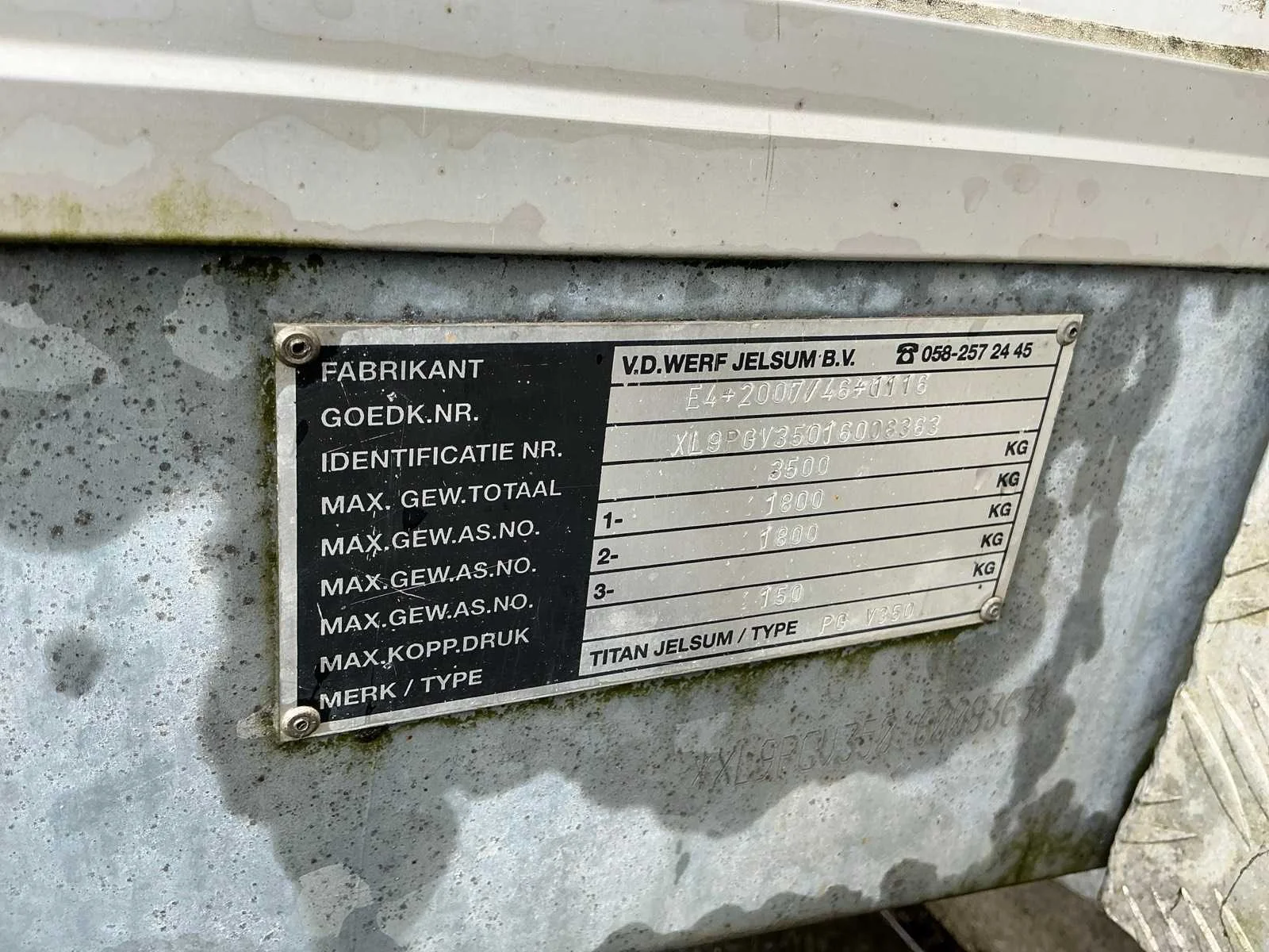 Voorzien van: 3 rolluiken, disselkist, verlichting, neuswiel, handrem, trekhaakkoppeling, reserveband, sleutels, mover Nee Merk: Titan jelsum Bouwjaar: 2016 Chassisnummer: XL9PGV35016008363 Aantal assen: 2 Laadbak afmeting l: 340cm Laadbak afmeting b: 180cm Ledig gewicht: 1120kg Laadvermogen: 2380kg Gesloten opbouw: true Datum eerste toelating: 2016-04-19 Datum eerste toelating (NL): 2016-04-19 Kenteken: 90-WN-VN Kentekenpapieren compleet?: true Hoogte: 165cm