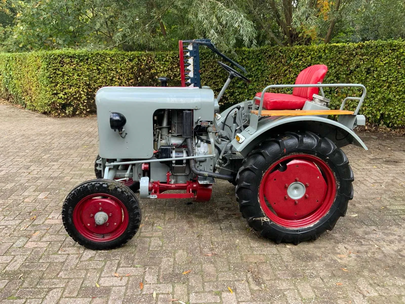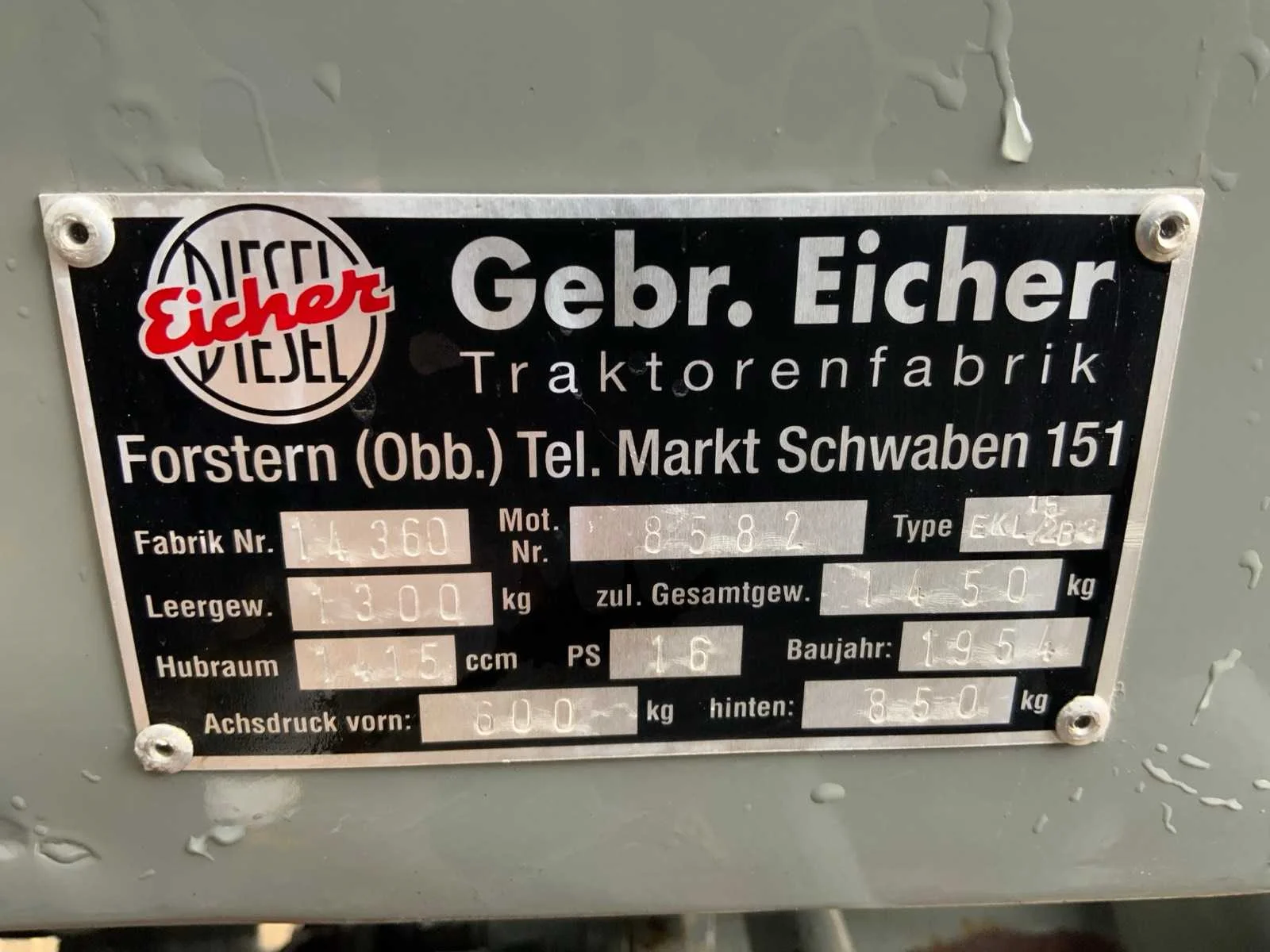 Voorzien van 16 Pk “Eicher” motor; lekt olie; maaibalk met werkbreedte van 155cm; Nee Merk: Eicher Type: EKL 15/2B3 Bouwjaar: 1954 Serienummer: 14360 Kenteken: TGV-88-T Bandenmaat voor: 4.50-16 Bandenmaat achter: 9-24 Aantal hydraulische ventielen achter: 1 Eigen gewicht: 1450kg Totale afmeting L: 2600mm Totale afmeting Breedte: 1600mm Totale afmeting Hoogte: 1800mm Kentekenpapieren compleet?: true Datum eerste toelating: 1954-06-30 Nationaliteit documenten: Nederlandsche