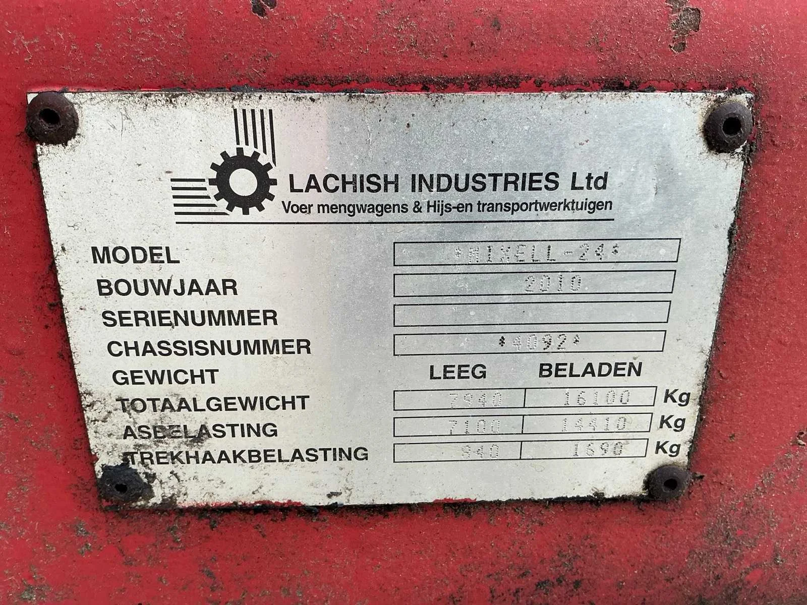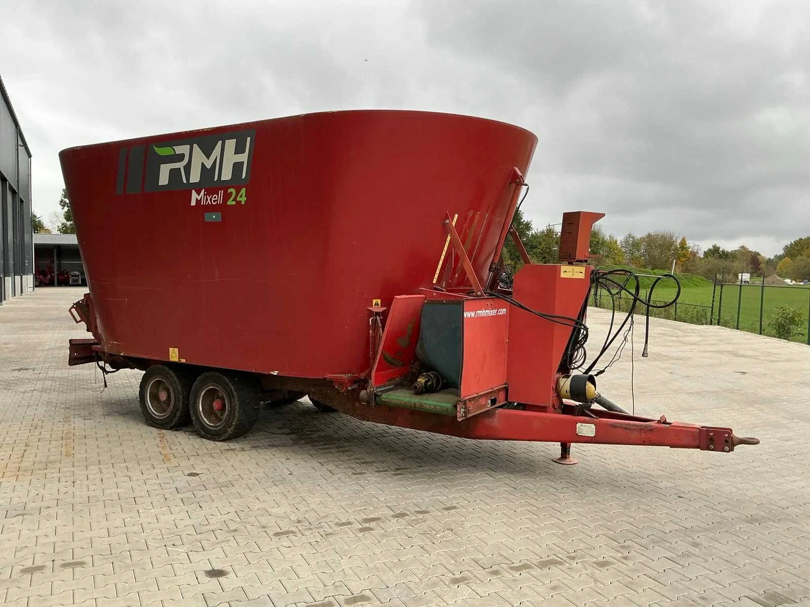 Voorzien van: brede hydraulische losdeur voorzijde, twee verticale mengvijzels, planetaire mengvertragingskasten, 2 mixersnelheden, mechanische bediening, messen op vijzel van hoogwaardig staal, 10 stuks messen, mechanische steunpoot, groothoek aftakas, achterbumper met verlichting, uitwerpband 750mm, RMH Simple feed 21 computer, 4 stuks tegen messen, hydraulisch geremd, 2 assen, benodigde vermogen 95Pk. Nee Merk: RMH Type: Mixell-24 Bouwjaar: 2010 Serienummer: 4092 Kenteken: LGN-41-H Tankinhoud: 24m³ Aantal mengwalsen: 2 Weeginrichting: true Totale afmeting L: 7350mm Totale afmeting Breedte: 2700mm Totale afmeting Hoogte: 3090mm
