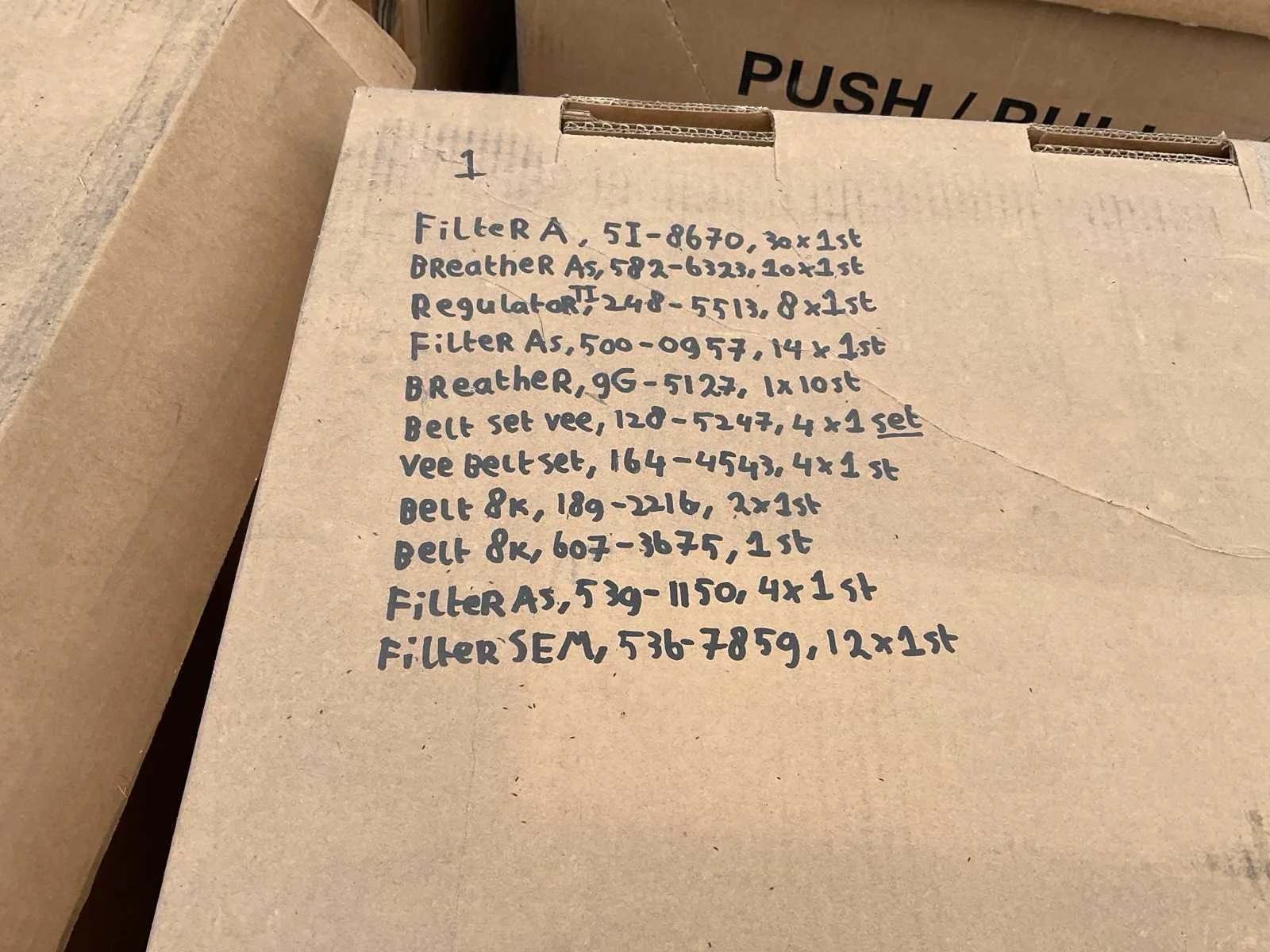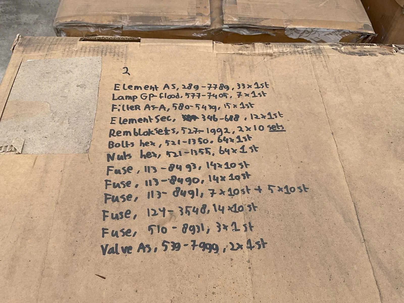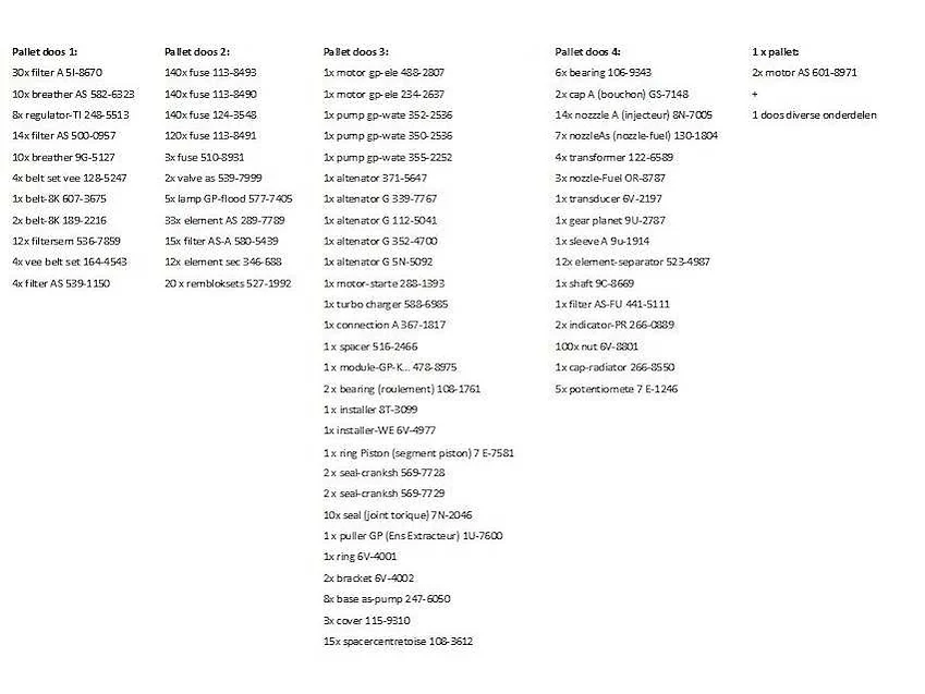 Op 5 pallets, bestaande uit onder andere: filters, keerringen, zekeringen, ruitenwissermotoren, buizen, pakkingen, lampen, v-snaren, No Merk: Caterpillar