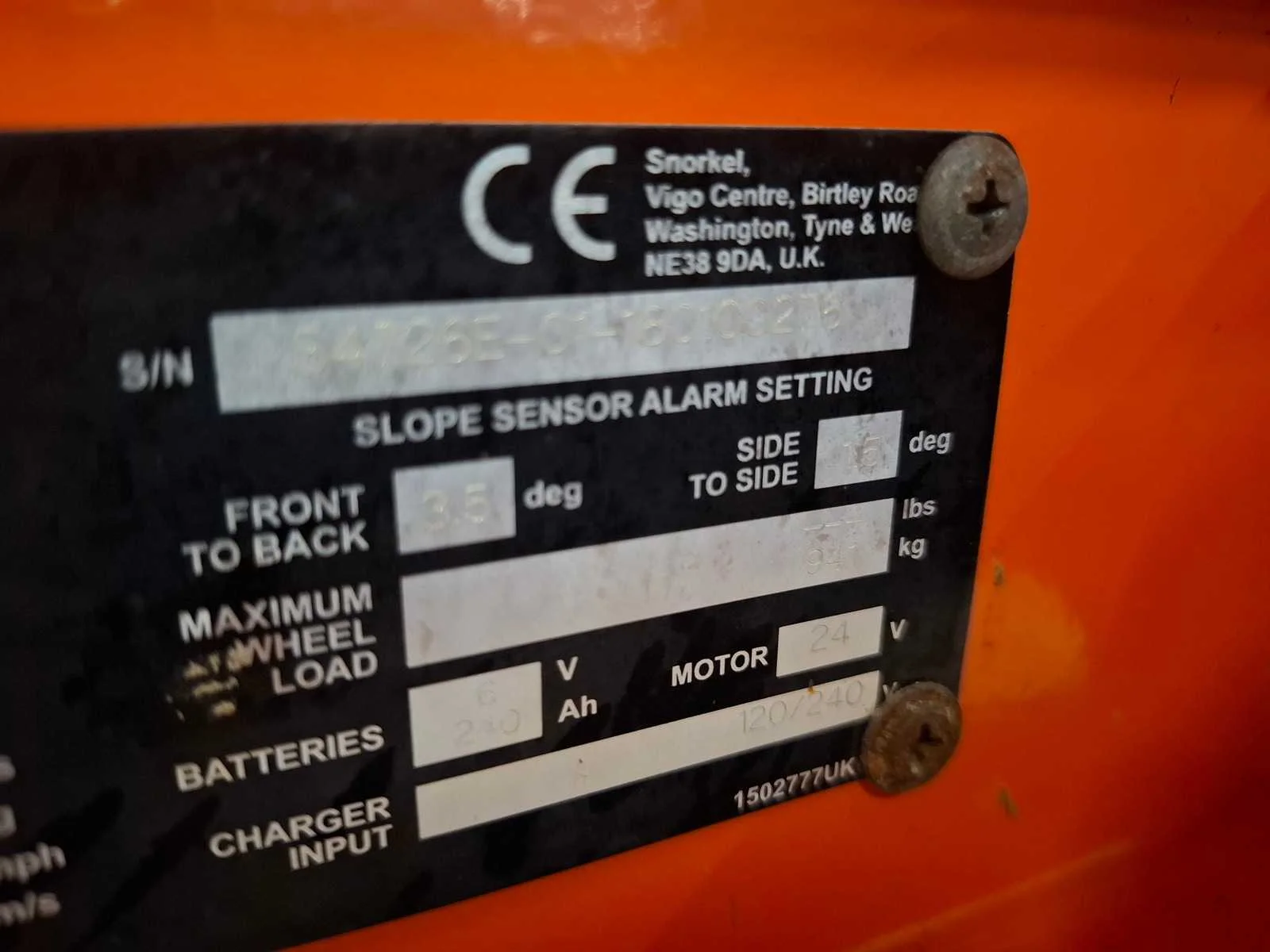 Urenstand niet afleesbaar Nee Merk: Snorkel Type: S4726E Bouwjaar: 2018 Serienummer: S4726E-01-180108276 Elektrisch: true Schaarhoogwerker: true Werkhoogte: 9800mm Horizontale rijkwijdte: 2140mm Plateau afm. l: 3360mm Plateau afm. b: 1090mm Platform capaciteit: 454kg Accu lader: true Eigen gewicht: 2250kg Totale afmeting L: 2300mm Totale afmeting Breedte: 1190mm Totale afmeting Hoogte: 1850mm
