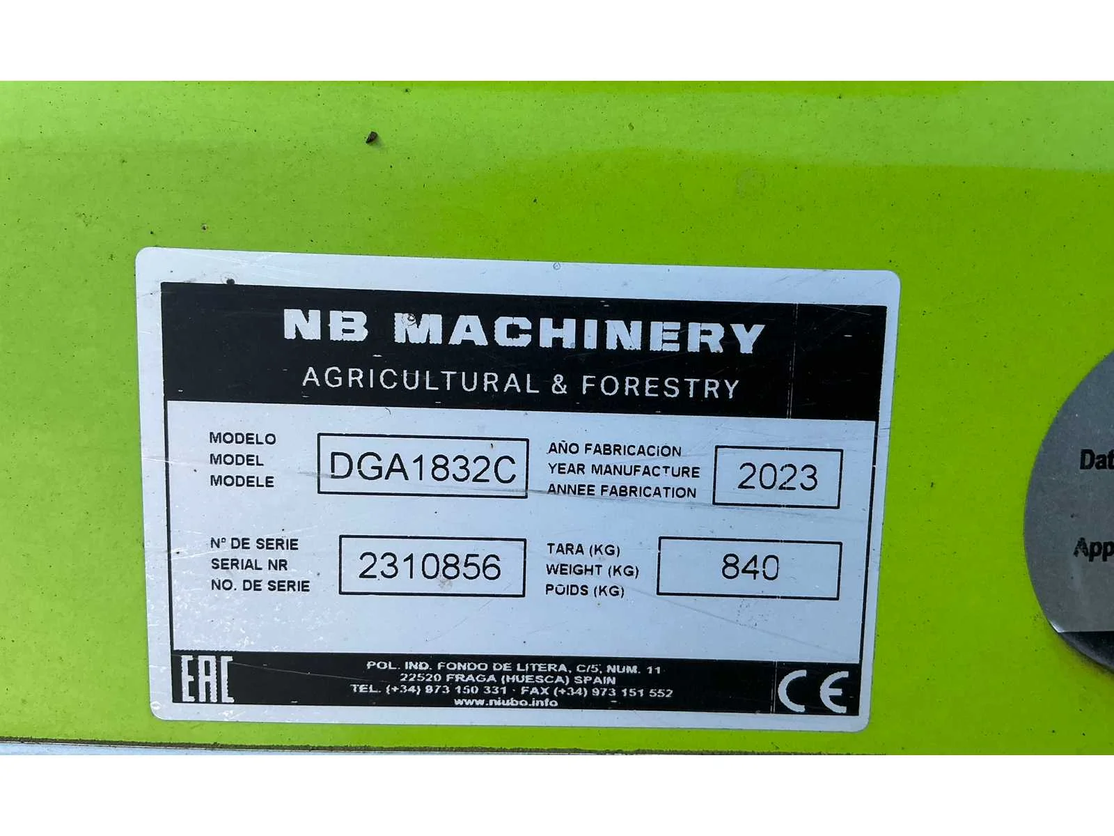 Kavel is voorzien van hefinrichting aansluiting. Nee Merk: Niubo Type: DGA1832C Bouwjaar: 2023 Eigen gewicht: 840kg Totale afmeting L: 2200mm Totale afmeting Breedte: 2000mm Totale afmeting Hoogte: 1100mm