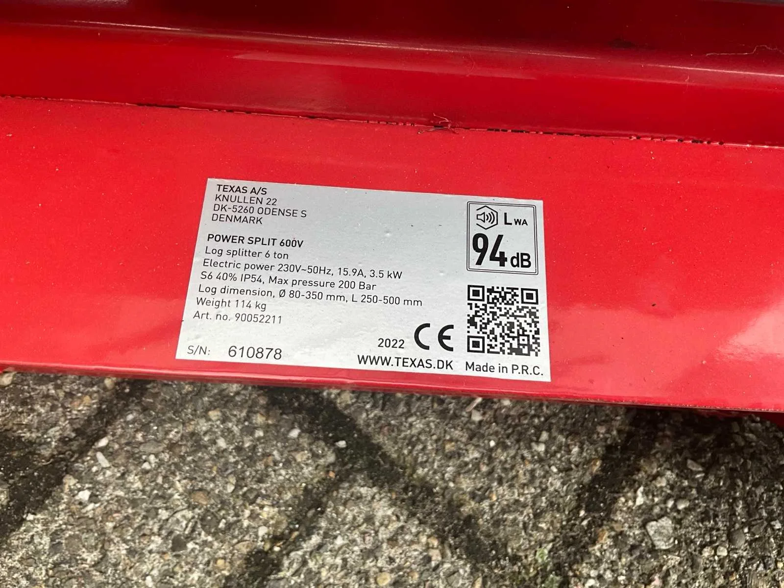 Voorzien van 230V aansluiting; max 6 ton kloofkracht; max diameter 350mm Nee Merk: Texas Type: A/S Bouwjaar: 2022 Serienummer: 610878 Capaciteit: 6t Bloklengte max.: 500mm Eigen gewicht: 114kg