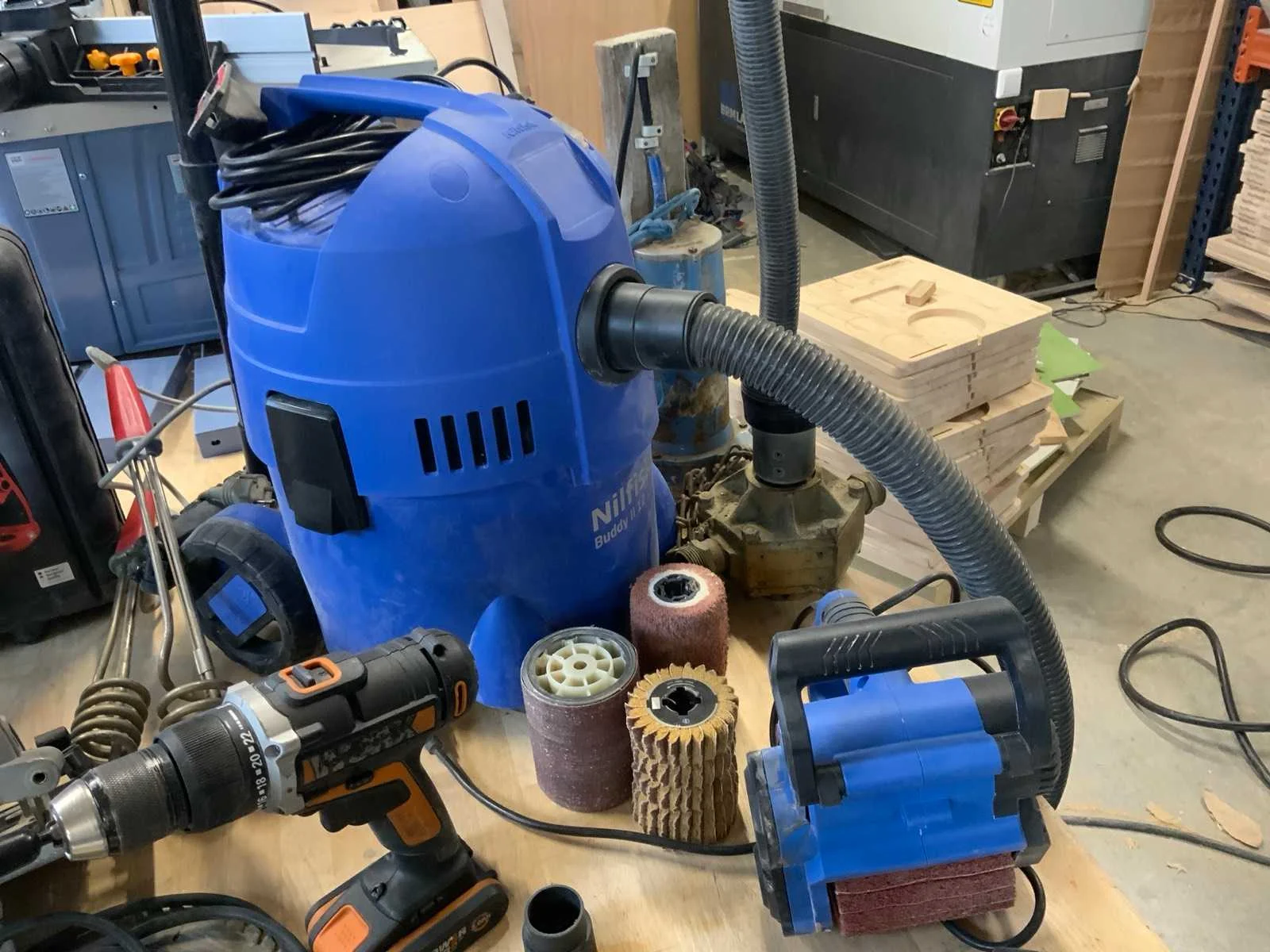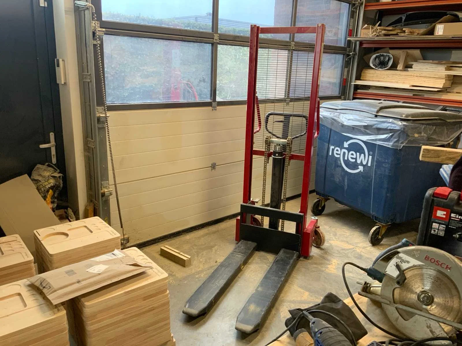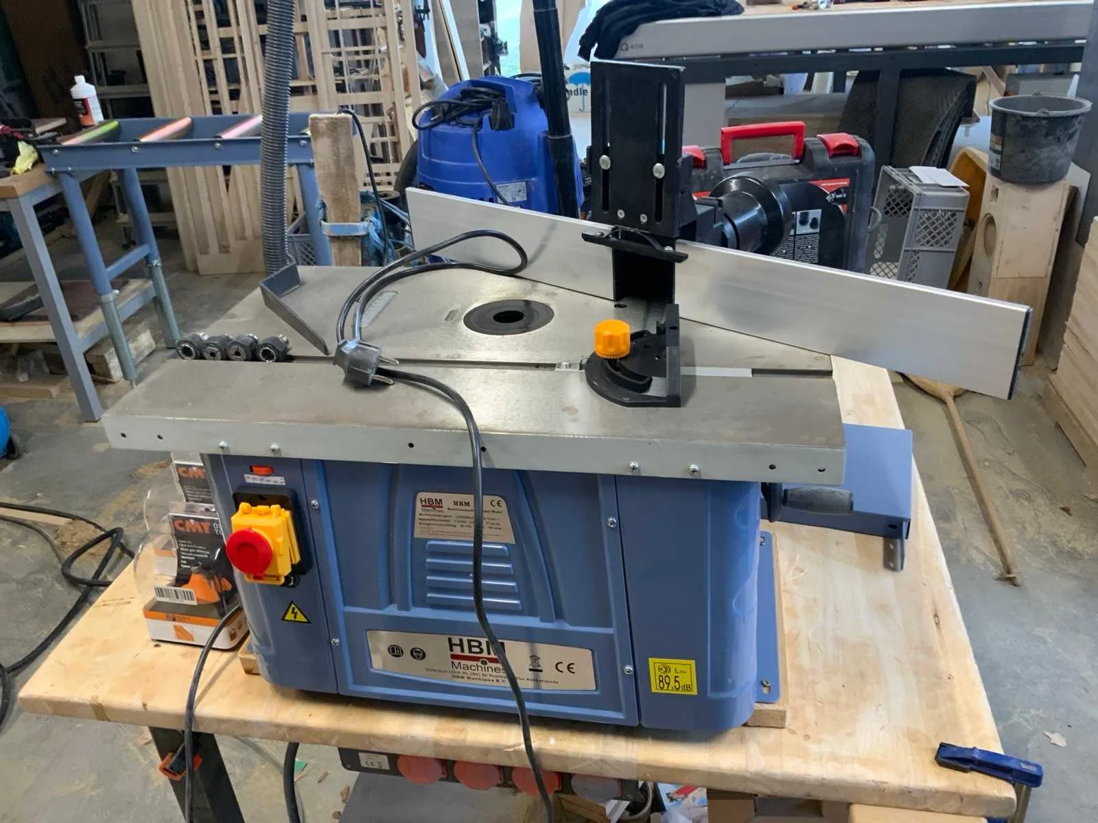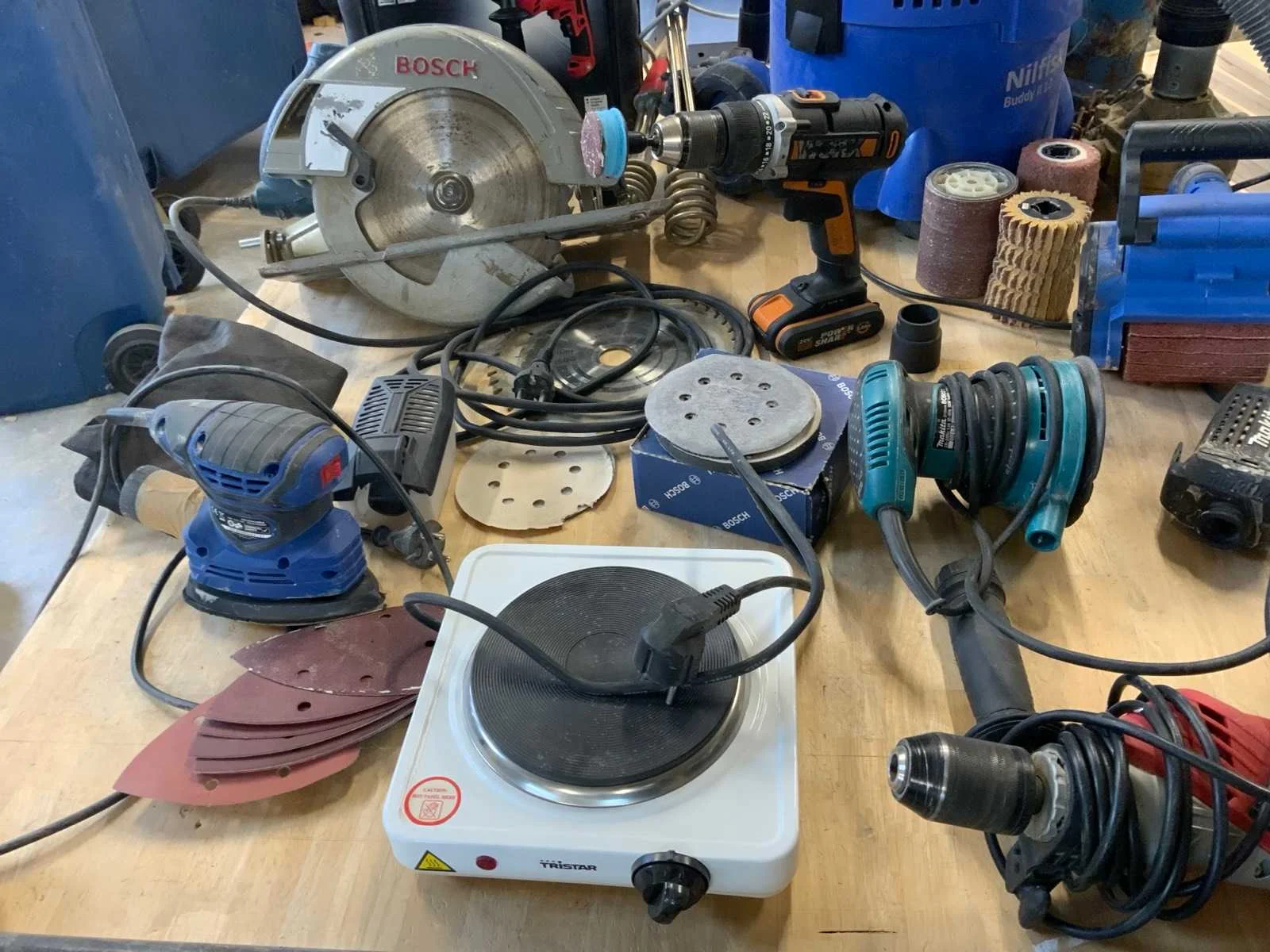 Bestaande uit oa Langgatboormachine Holzmann LBM290 Rollenbaan HBM 1000mm Stofzuiger Nilfisk Buddy II 12 Satineermachine HBM Slagboormachine Einhell RT-ID 65/1 Excentrische schuurmachine Makita 125mm BO5031 Accuboormachine Worx Schuurmachine Varo Keramische kookplaat Pijpklem lijmklem Cirkelzaag Bosch GKS85 met extra zaagblad Waterpomp 2x Vloeistofverwarmers 2x Stapelaar 160cm hoogte handmatig Stelling 60cm mecalux, schapbreedte 1900mm, hoogte 3000mm Houtfreesmachine HBM 40 Kolomboor pattfield PE-800 TBM Frezen CMT Nee