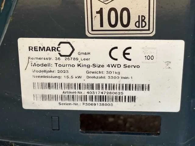 Remarc Tourno King Size 4WD Servo 135cm demo * Frontmaaier * demonstratie unit * 135cm. maaidek * 2 in 1 achterlossende en mulchfunctie * vierwielaandrijving * hydrostatische wielaandrijving * stuurbekrachtiging * Luchtgeveerde stoel * hoge rugleuning * hendel om te kiezen tussen mulch en achteruitworp * electrische hoogteverstelling van het maaidek * hydrogear T3 aandrijving * Honda GXV630 * 2-cilinder * 20,8 pk benzine motor * 8,5 liter brandstof tank * electrische start * LED verlichting * 305 KG * slechts 28 uur * bouwjaar 2023 * bouwjaar maaidek 2021 * Winkelverkoopprijs € 15.170 excl. BTW * Nee Merk: Remarc Type: Tourno King size 4WD Servo Bouwjaar: 2023 Serienummer: F3069138003 Eigen gewicht: 301kg Totale afmeting L: 2440mm Totale afmeting Breedte: 1350mm Totale afmeting Hoogte: 1240mm