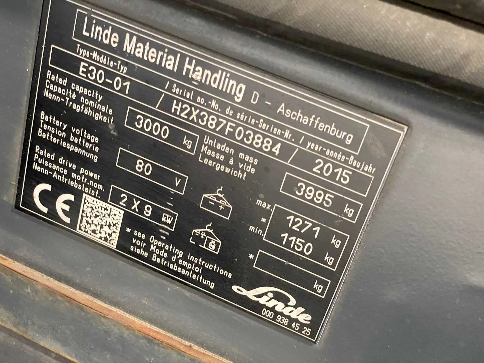 Nee Merk: Linde Type: E30-01 Bouwjaar: 2015 Brandstof: Electric Mast: Duplo Aantal wielen: 4 Afgelezen urenstand: 10686 Side-shift: true Hydraulisch verstelbare lepels: true Duplex mast: true Eigen gewicht: 5200kg Hefvermogen: 3000kg Hefhoogte: 4690mm Vol rubber banden: true Totale afmeting L: 2500mm Totale afmeting Breedte: 1200mm Totale afmeting Hoogte: 2970mm