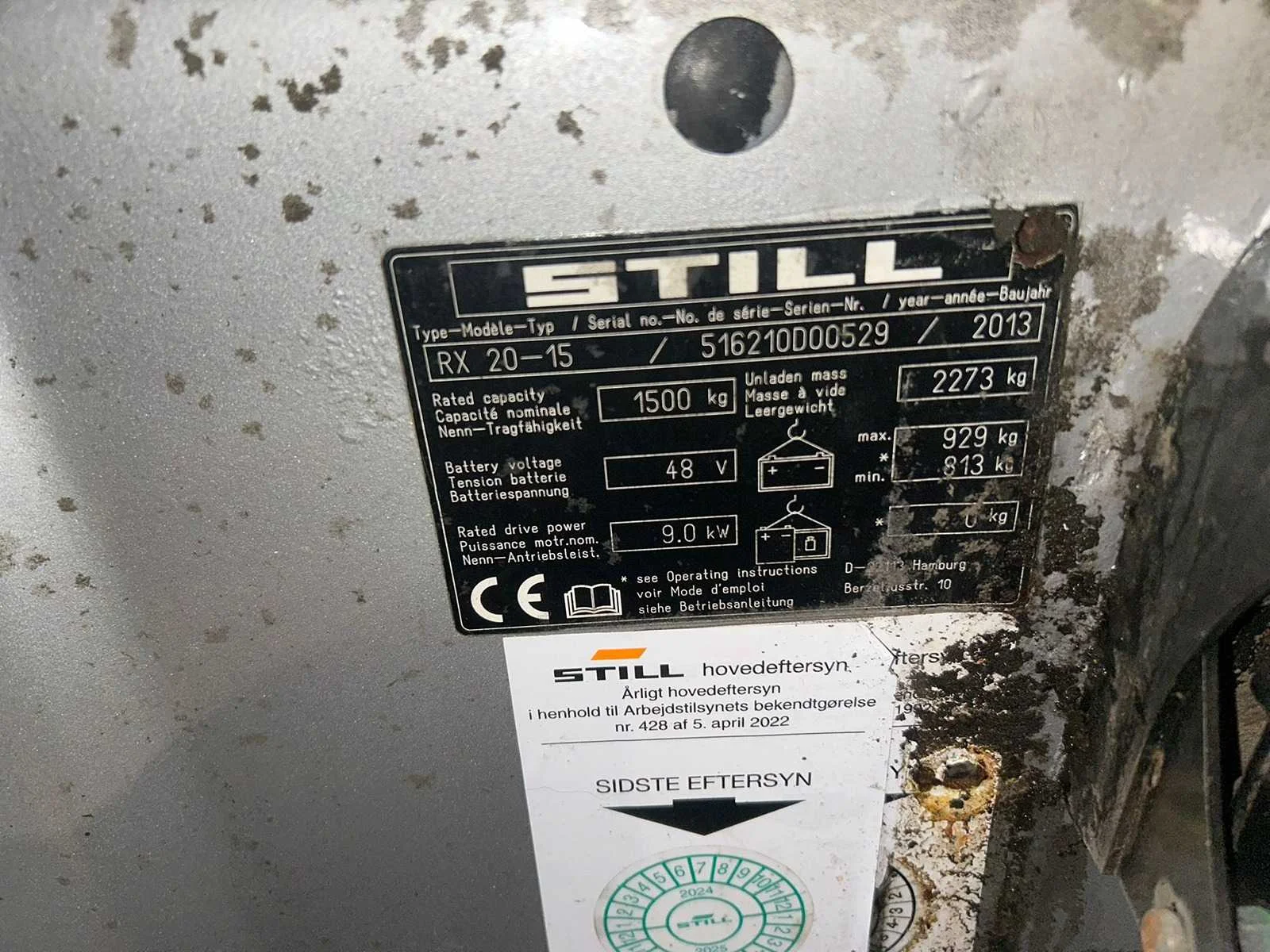 Bezichtiging op afspraak!!! Nee Merk: Still Type: RX20-15 Bouwjaar: 2013 Brandstof: Elektrisch Aantal wielen: 3 Afgelezen urenstand: 12349 Accu lader: true Free-lift: true Side-shift: true Triple mast: true Eigen gewicht: 3057kg Hefvermogen: 1500kg Lepellengte: 1100mm Hefhoogte: 5220mm Vol rubber banden: true Totale afmeting L: 2000mm Totale afmeting Breedte: 1150mm Totale afmeting Hoogte: 2260mm