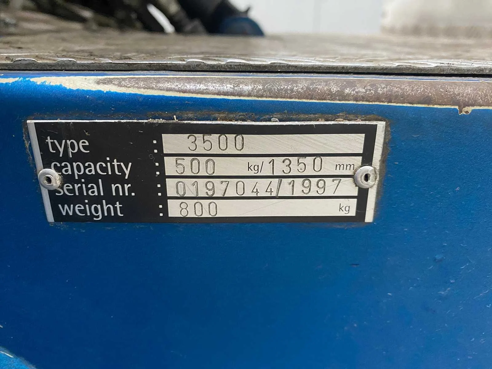 2017 batterij Nee Merk: Prins Type: 3500 Bouwjaar: 1997 Serienummer: 90092 Brandstof: elektrisch Aantal wielen: 4 Accu lader: true Free-lift: true Eigen gewicht: 1650kg Hefvermogen: 500kg Lepellengte: 1000mm Hefhoogte: 1320mm Minimale doorrijhoogte: 1920mm Totale afmeting L: 1900mm Totale afmeting Breedte: 1150mm Totale afmeting Hoogte: 2000mm