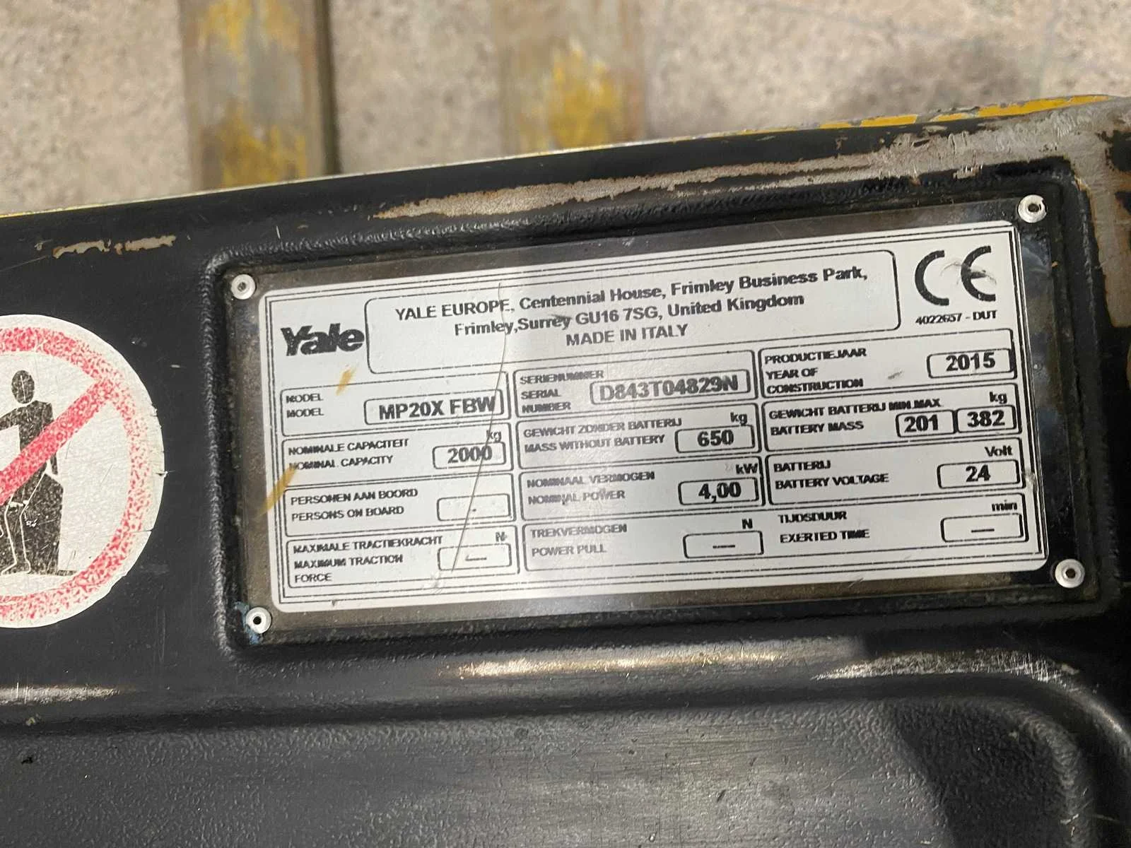 Nee Merk: Yale Type: MP20X Bouwjaar: 2015 Serienummer: D843T04829N Hefvermogen: 2000kg Lepellengte: 1200mm Accu lader: true Afgelezen urenstand: 3285 Eigen gewicht: 807kg Totale afmeting L: 2300mm Totale afmeting Breedte: 750mm Totale afmeting Hoogte: 1500mm