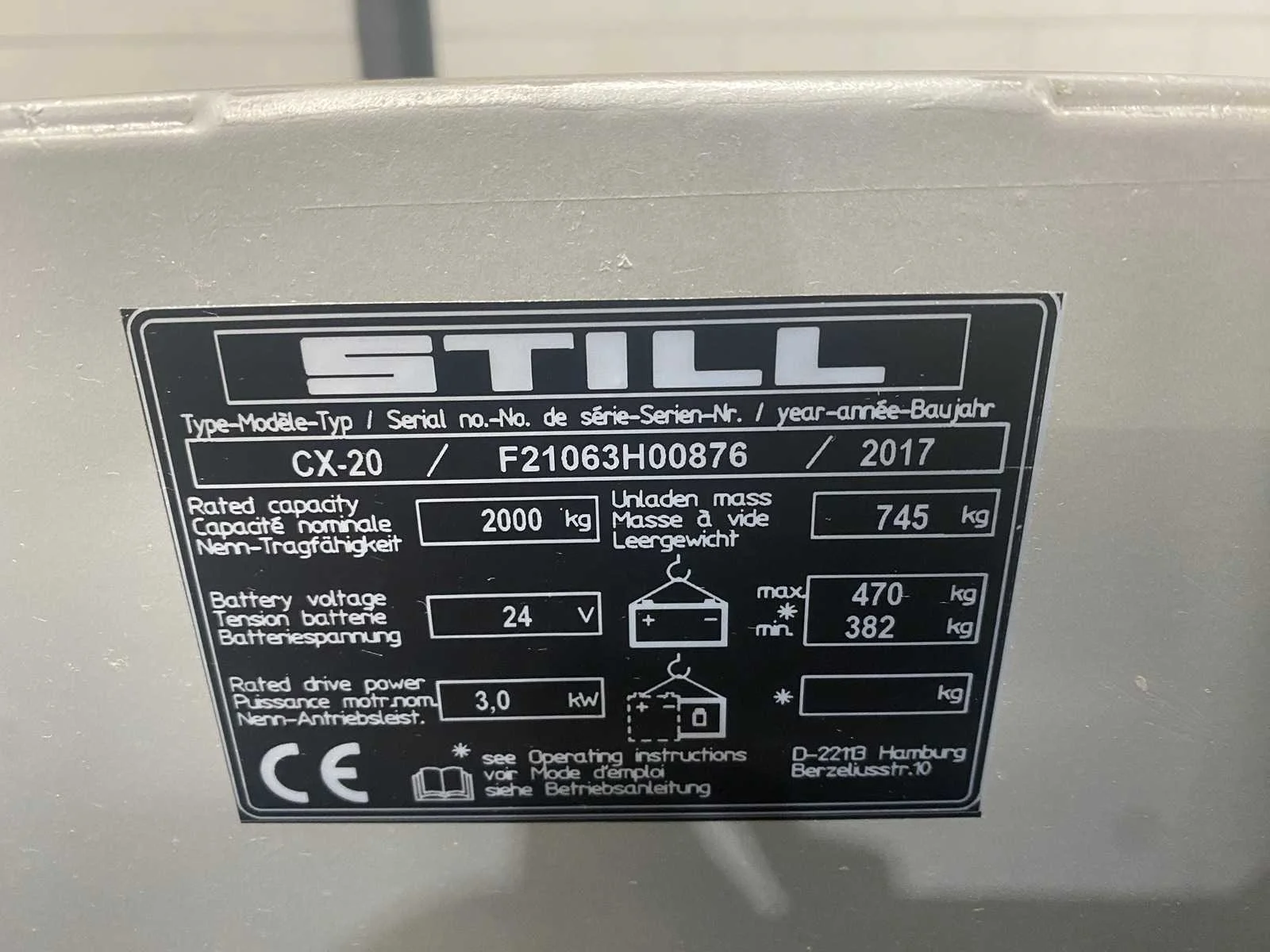 2018 Batterij Nee Merk: Still Type: CX 20 Bouwjaar: 2017 Serienummer: F21063H00876 Hefvermogen: 2000kg Lepellengte: 2400mm Accu lader: true Afgelezen urenstand: 5345 Eigen gewicht: 1150kg Totale afmeting L: 3200mm Totale afmeting Breedte: 800mm Totale afmeting Hoogte: 1300mm
