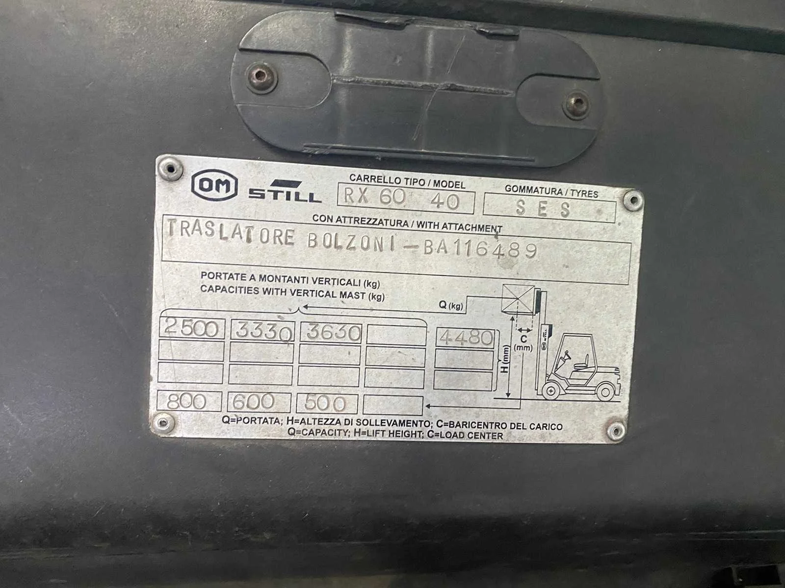 Nee Merk: Still Type: RX60-40 Bouwjaar: 2011 Serienummer: 516327B00120 Brandstof: elektrische Aantal wielen: 4 Afgelezen urenstand: 14662 Accu lader: true Side-shift: true Hydraulisch verstelbare lepels: true Duplex mast: true Eigen gewicht: 6477kg Hefvermogen: 4000kg Lepellengte: 1150mm Hefhoogte: 4480mm Minimale doorrijhoogte: 2970mm Totale afmeting L: 2950mm Totale afmeting Breedte: 1250mm Totale afmeting Hoogte: 2970mm