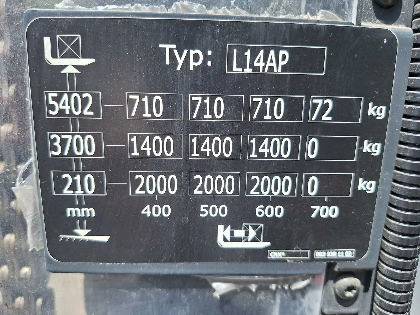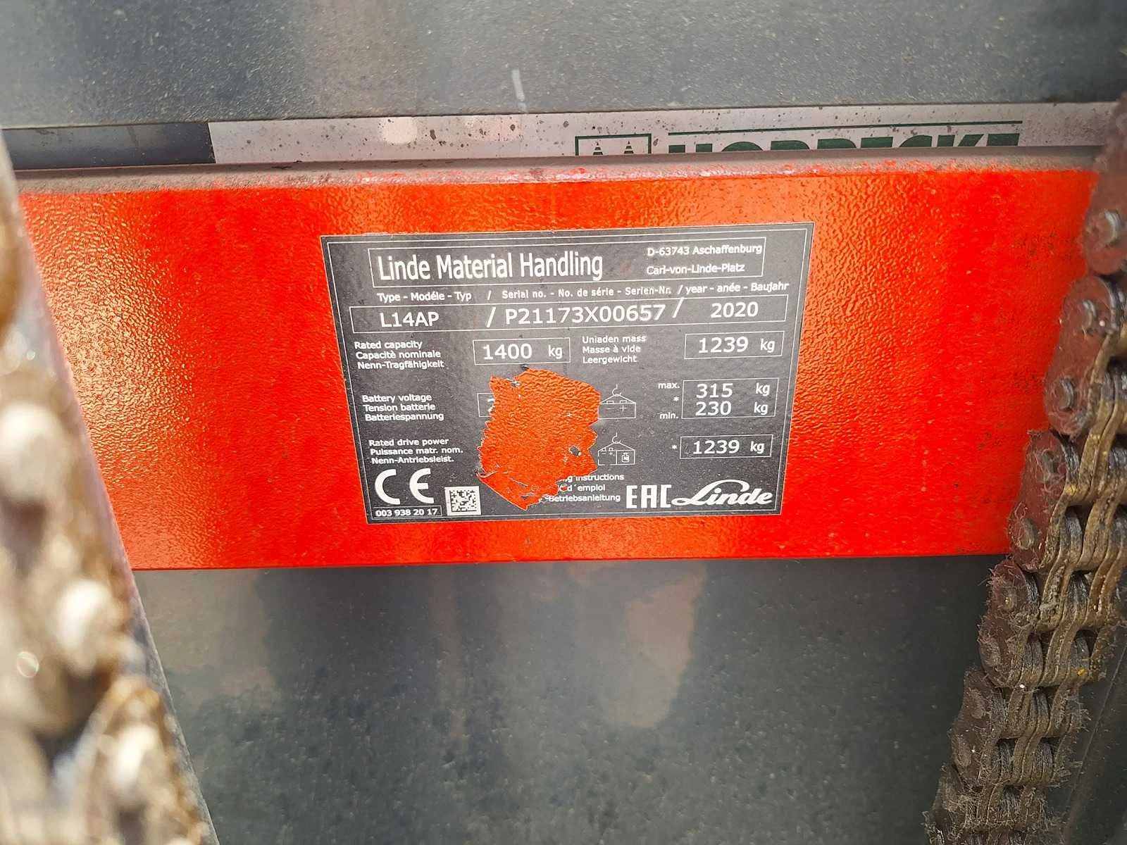 Bezichtiging op afspraak!!! Nee Merk: Linde Type: L14AP Bouwjaar: 2020 Hefvermogen: 1400kg Hefhoogte: 5400mm Lepellengte: 1150mm Afgelezen urenstand: 385 Eigen gewicht: 1500kg Totale afmeting Breedte: 800mm Totale afmeting Hoogte: 230mm Accu lader: true