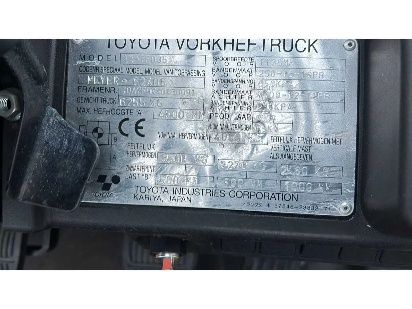Bezichtiging op afspraak! Nee Merk: Toyota Type: 42-7FD35 Bouwjaar: 2008 Brandstof: Diesel Aantal wielen: 4 Afgelezen urenstand: 11899 Eigen gewicht: 6255kg Hefvermogen: 4000kg Lepellengte: 1200mm Diesel: true