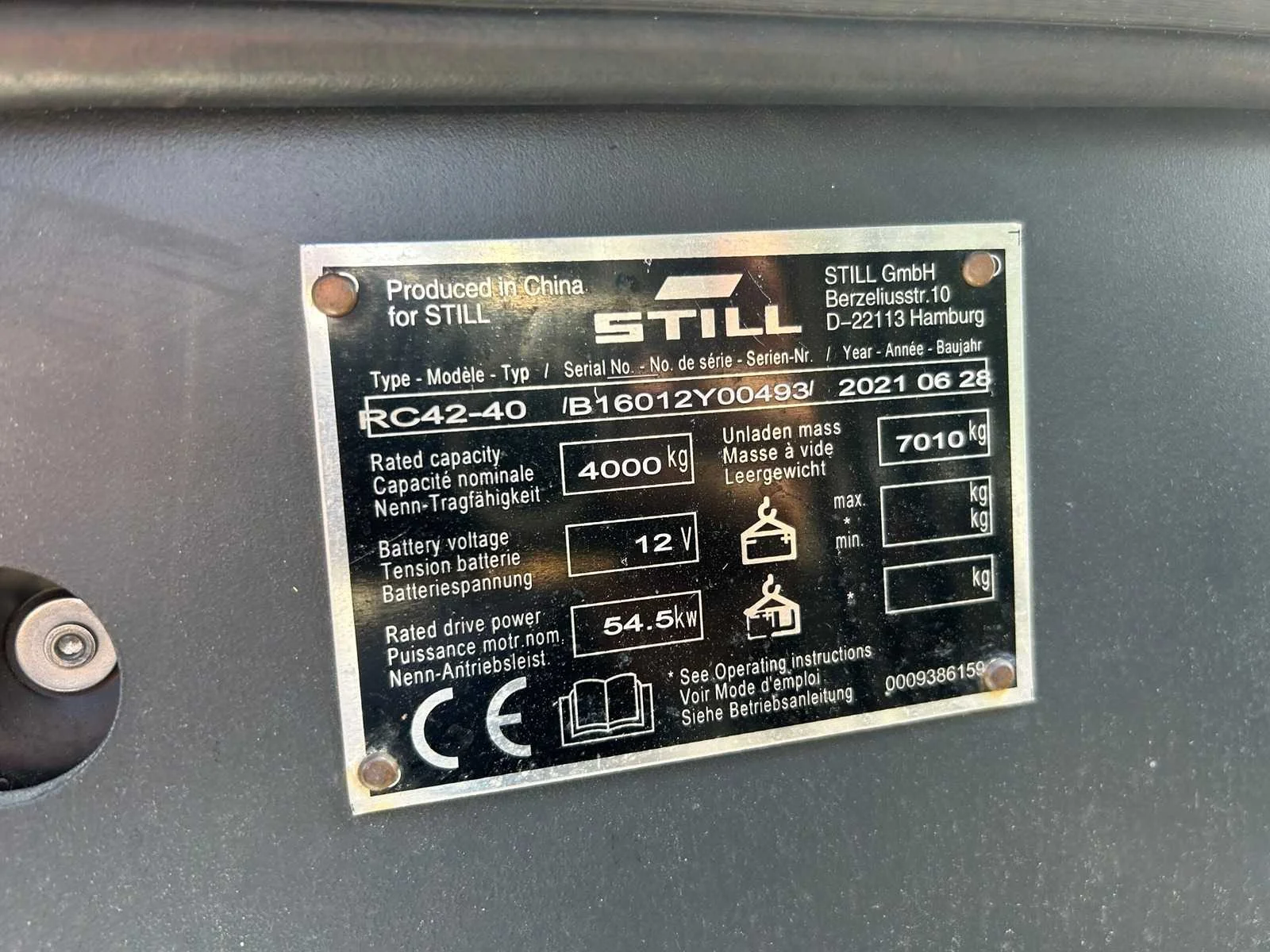 Dichte cabine 4de functie tot vorkenbord Nee Merk: Still Type: RC42-40 Bouwjaar: 2021 Brandstof: Diesel Aantal wielen: 4 Afgelezen urenstand: 6 Side-shift: true Duplex mast: true Eigen gewicht: 7010kg Hefvermogen: 4000kg Hefhoogte: 3300mm
