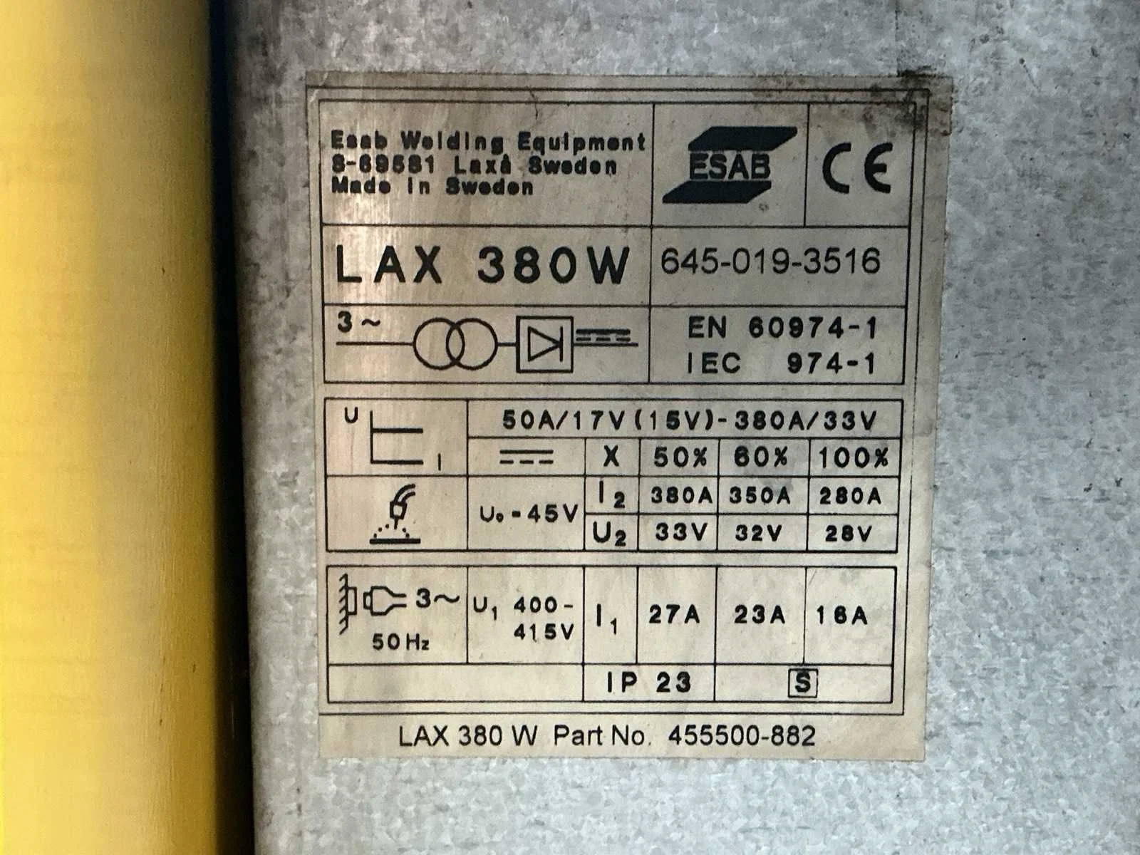 Nee Merk: ESAB Type: LAX 380 Mig type: true Ampère belasting: 380A Draadaanvoerunit: true Aansluiting: 400V