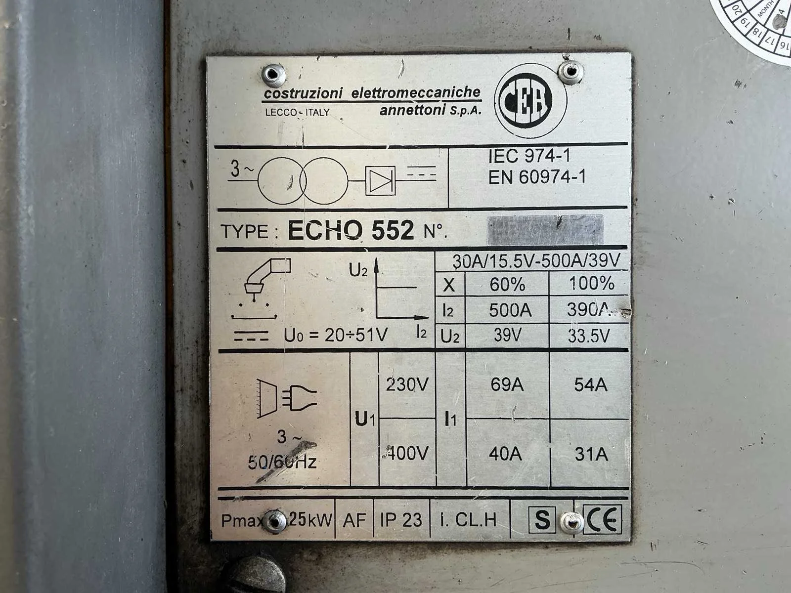Nee Merk: CEA Type: ECHO 552 Mig type: true Ampère belasting: 500A Draadaanvoerunit: true Aansluiting: 400V