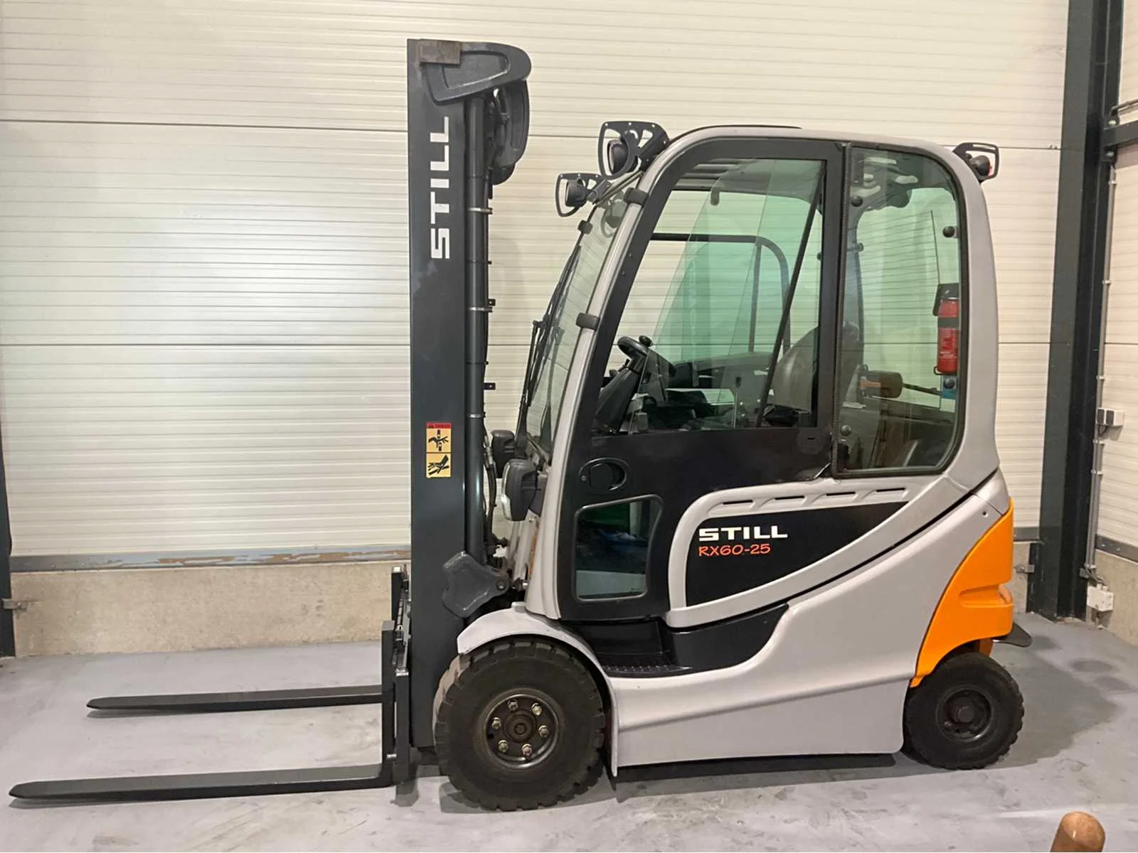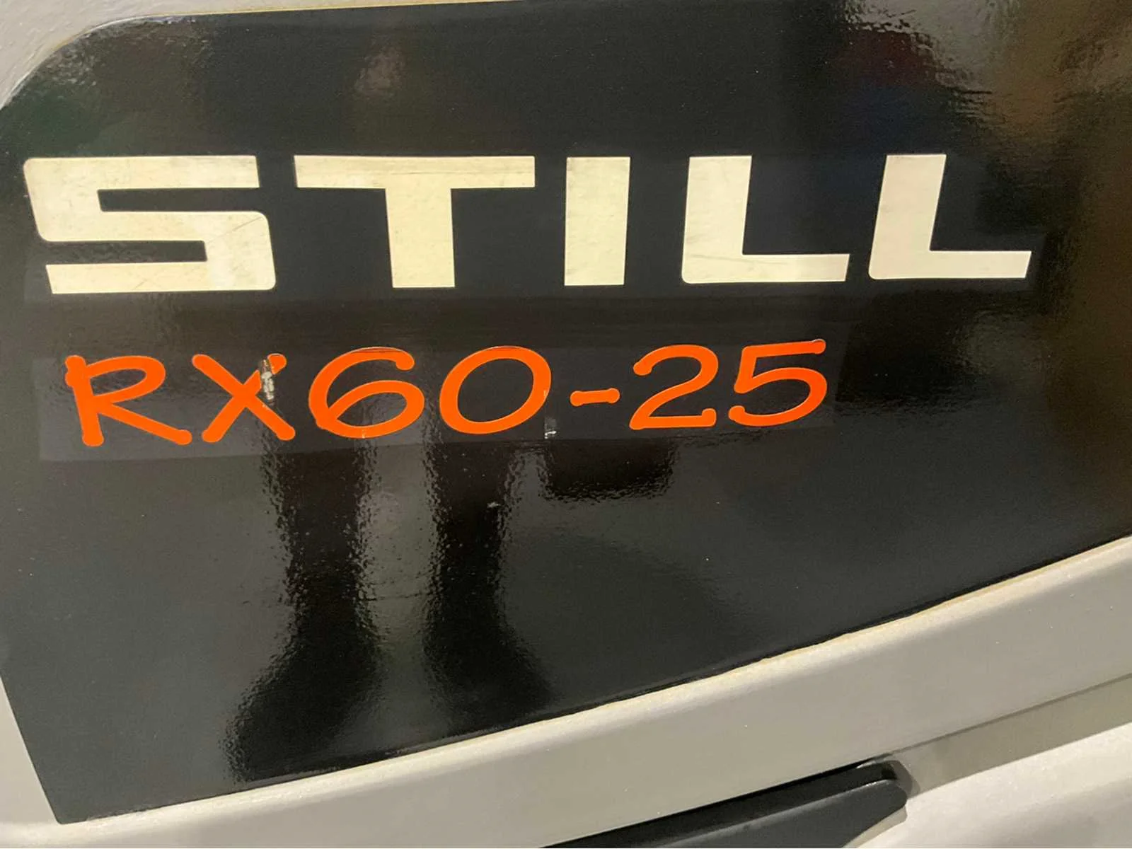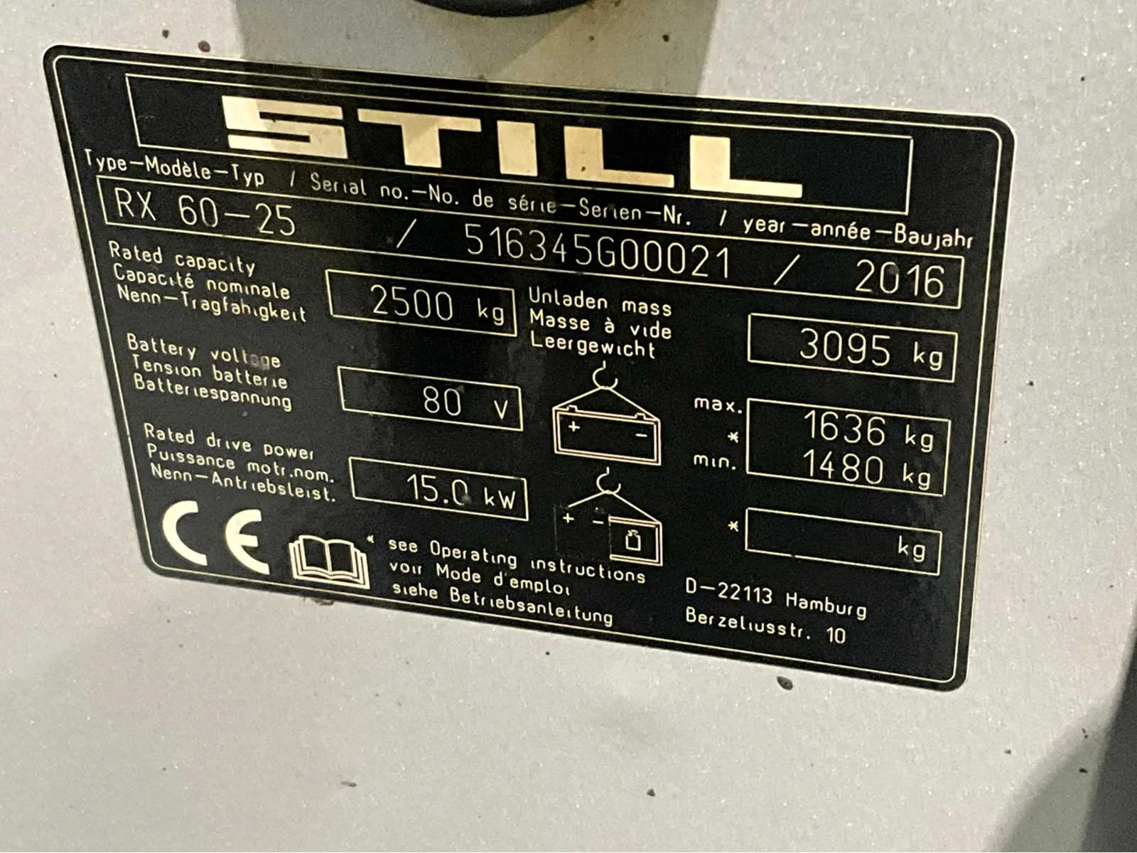 Extra opties : Blue spot , Led verlichting voor en achter , dagrijverlichting , brandblusser , joy stick , ongebruikte lepels , volledige cabine , binnen verlichting , zwaailamp Nee Merk: Still Type: RX 60-25 Bouwjaar: 2016 Serienummer: 516345G00021 Aantal wielen: 4 Afgelezen urenstand: 1873 Eigen gewicht: 4575kg Hefvermogen: 2500kg Hefhoogte: 3670mm Totale afmeting L: 3540mm Totale afmeting Breedte: 1070mm Totale afmeting Hoogte: 2490mm