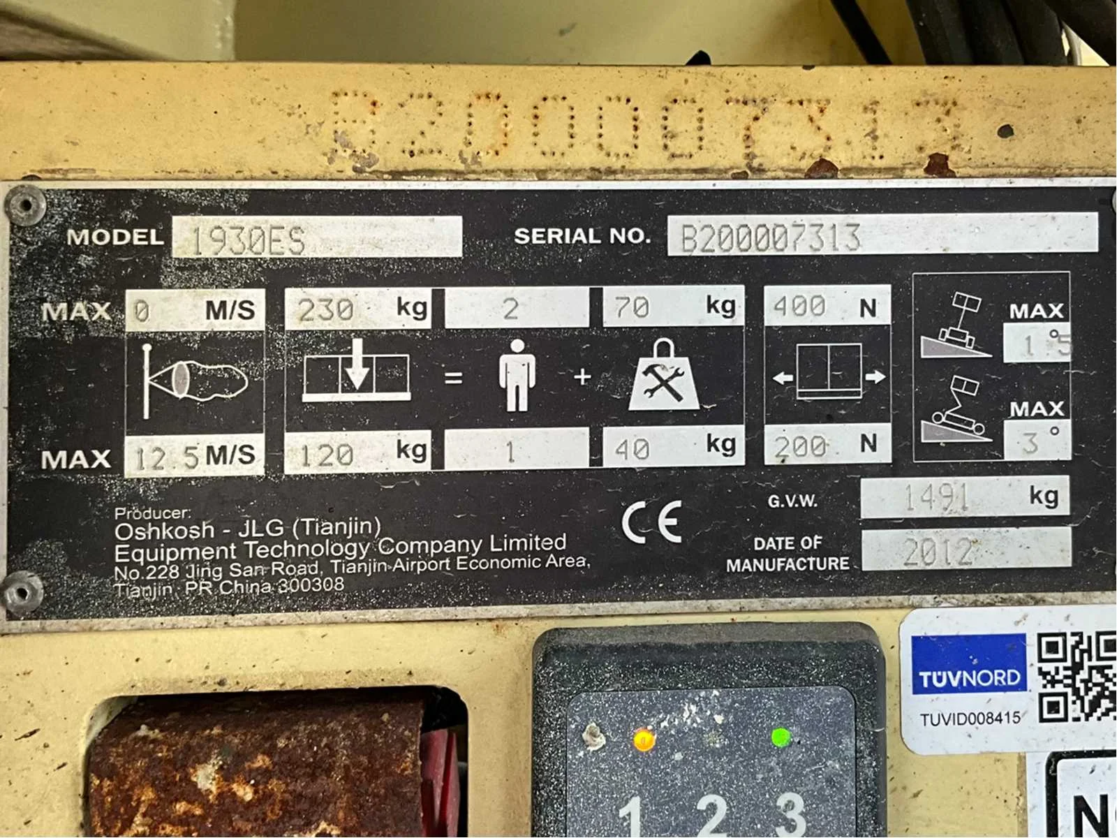 Gebruik: binnen en buiten; platform vloerhoogte 5700 mm; uitschuifbaar platform afmeting circa 2750x750 mm; interne acculader 230 Volt; kooibediening; transporthoogte circa 1750 mm; working condition Nee Merk: JLG Type: 1930ES Bouwjaar: 2012 Serienummer: B200007313 Elektrisch: true Schaarhoogwerker: true Werkhoogte: 7700mm Plateau afm. l: 1850mm Plateau afm. b: 750mm Platform capaciteit: 230kg Afgelezen urenstand: 636 Eigen gewicht: 1565kg Totale afmeting L: 1900mm Totale afmeting Breedte: 800mm Totale afmeting Hoogte: 2050mm