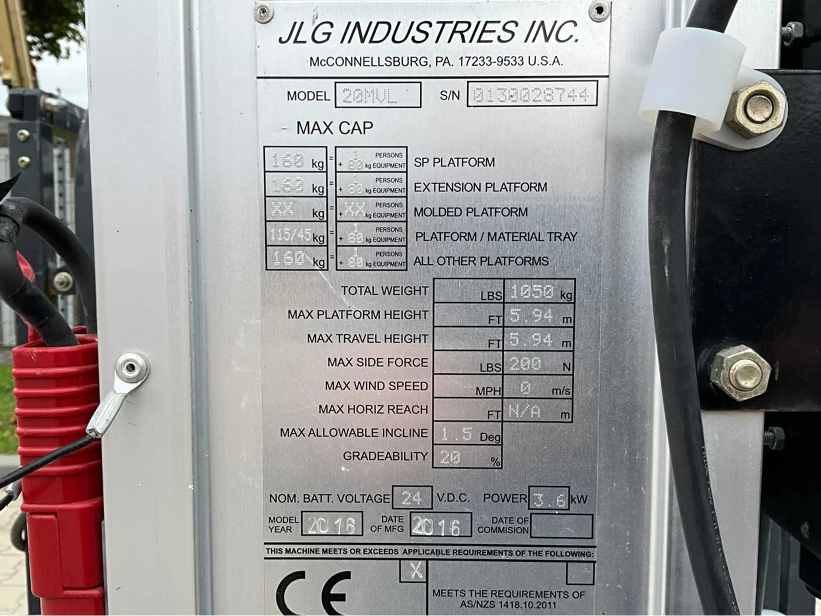 Verrijdbaar; staal / aluminium; maximum platform vloerhoogte 5940 mm; kooibediening; 230 Volt stroom aansluiting platform; uitschuifbaar plateau afmeting 1200x650 mm; ingebouwde acculader; 24 Volt; 230 Volt; working condition; Nee Merk: JLG Type: 20MVL Bouwjaar: 2016 Serienummer: 0130028744 Elektrisch: true Masthoogwerker: true Werkhoogte: 7940mm Plateau afm. l: 650mm Plateau afm. b: 650mm Platform capaciteit: 160kg Accu lader: true Afgelezen urenstand: 209 Eigen gewicht: 1050kg Totale afmeting L: 1050mm Totale afmeting Breedte: 800mm Totale afmeting Hoogte: 2050mm