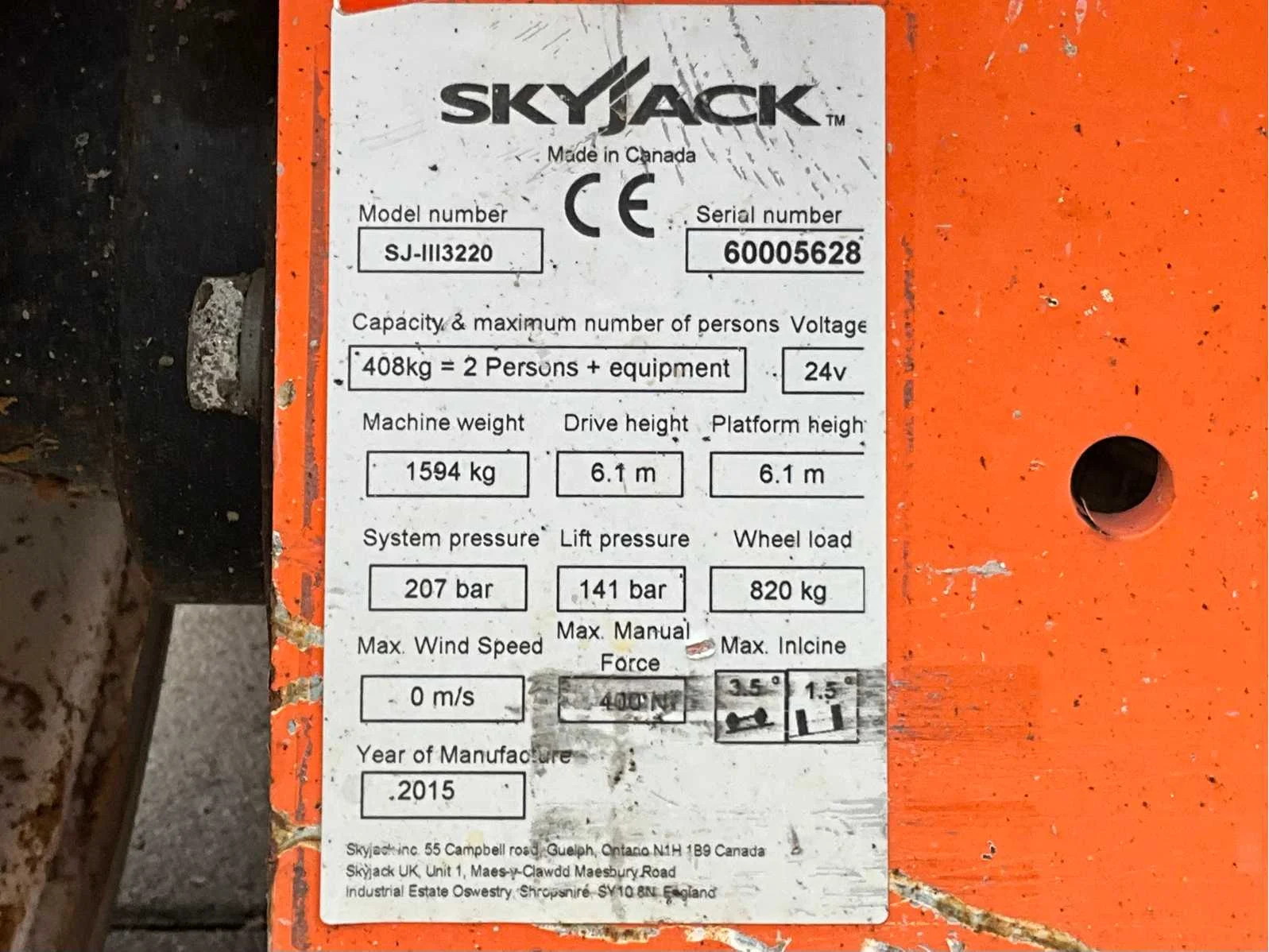 Platform vloerhoogte 6100 mm; uitschuifbaar platform afmeting circa 3020x710 mm; interne acculader 230 Volt; kooibediening; 230 Volt stroom aansluiting platform; transporthoogte circa 1750 mm; working condition; Nee Merk: SkyJack Type: SJ III 3220 Bouwjaar: 2015 Serienummer: 60005628 Elektrisch: true Schaarhoogwerker: true Werkhoogte: 8100mm Plateau afm. l: 2320mm Plateau afm. b: 710mm Platform capaciteit: 408kg Accu lader: true Afgelezen urenstand: 297 Eigen gewicht: 1600kg Totale afmeting L: 2330mm Totale afmeting Breedte: 840mm Totale afmeting Hoogte: 2080mm