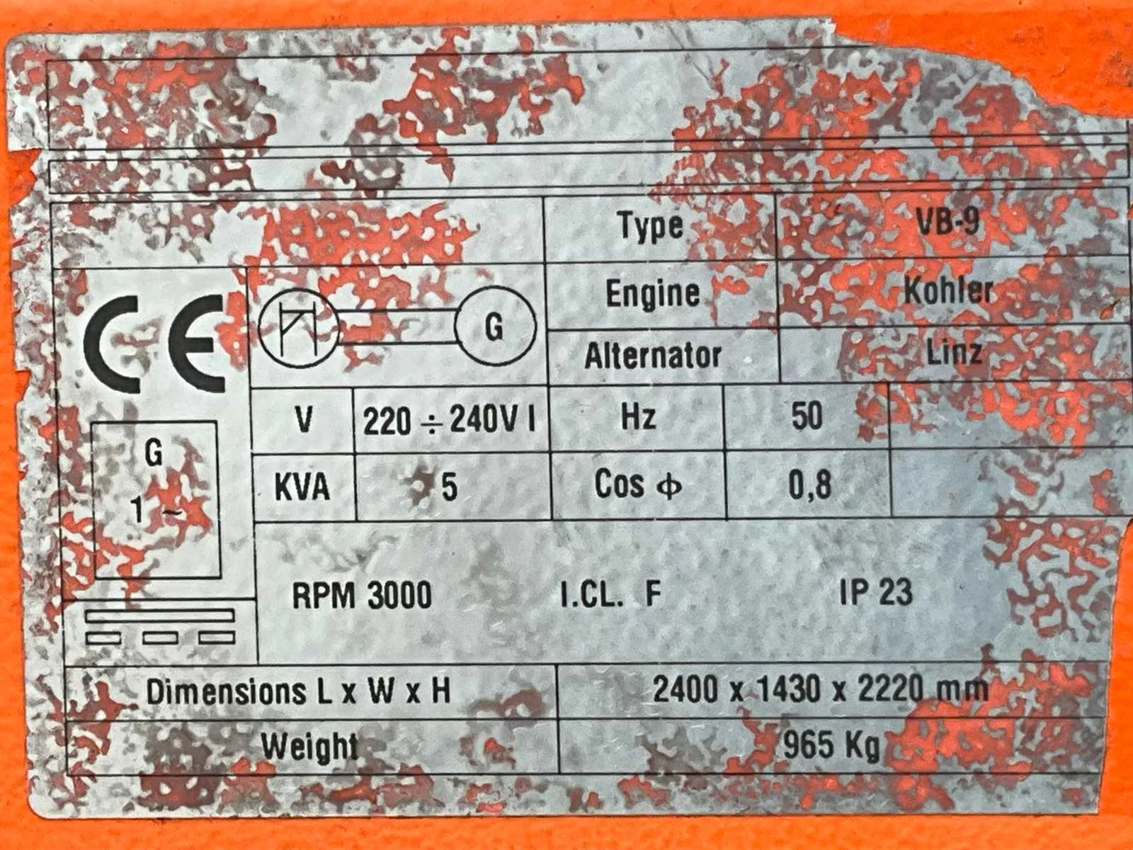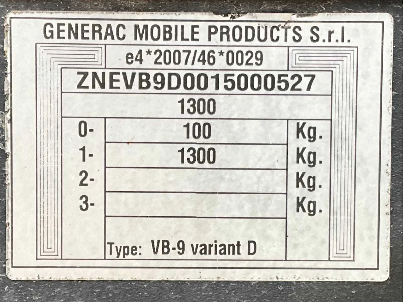 Lengte 2400 mm; breedte 1450 mm; hoogte 2250 mm; Kohler diesel motor; Linz alternator; 6x150 Watt LED lampen; 230 Volt; maximale masthoogte 8 meter; afgelezen urenstand 860 uren; lichtsensor; tijdschakelaar; heftruck vorksleuven; 4x stabilisator stempels; ingebouwde brandstoftank; tankinhoud 170 liter; neuswiel; working condition; (de koper dient bij transport over de weg zelf te voorzien in een geldig kenteken; een 7 of 9 polige aansluitstekker of verloopstuk met kabel (verlengsnoer kan ter plaatse tegen betaling aangekocht worden); eventueel extra lichtbalk); Belgische kentekenpapieren; gelijkvormigheidsattest; (Q-ABN-536) Nee Merk: TowerLight Type: VB-9 LED Bouwjaar: 2015 Chassisnummer: ZNEVB9D0015000527 + 1503207 Aantal assen: 1 Ledig gewicht: 1100kg Laadvermogen: 100kg Hoogte: 2cm