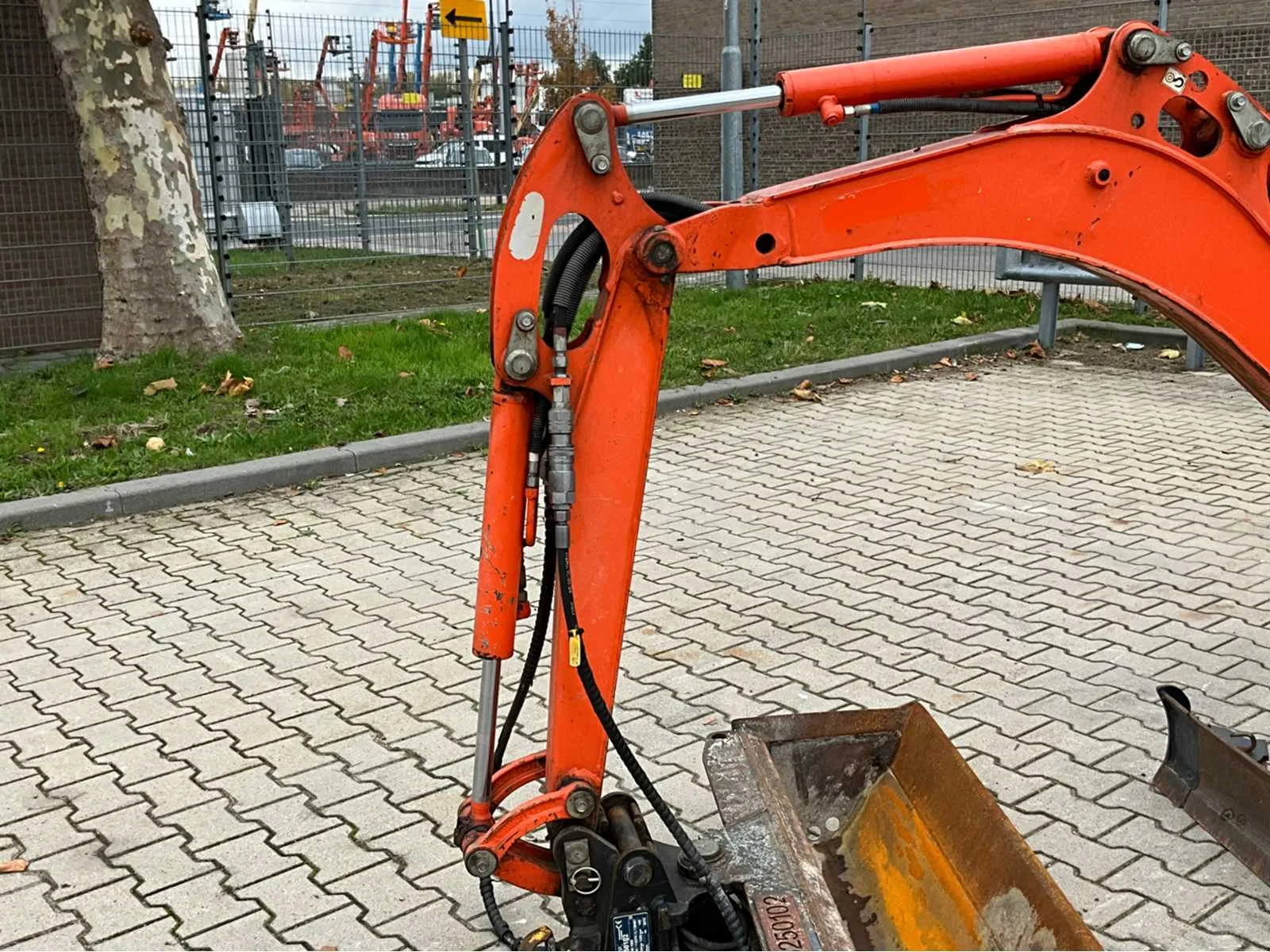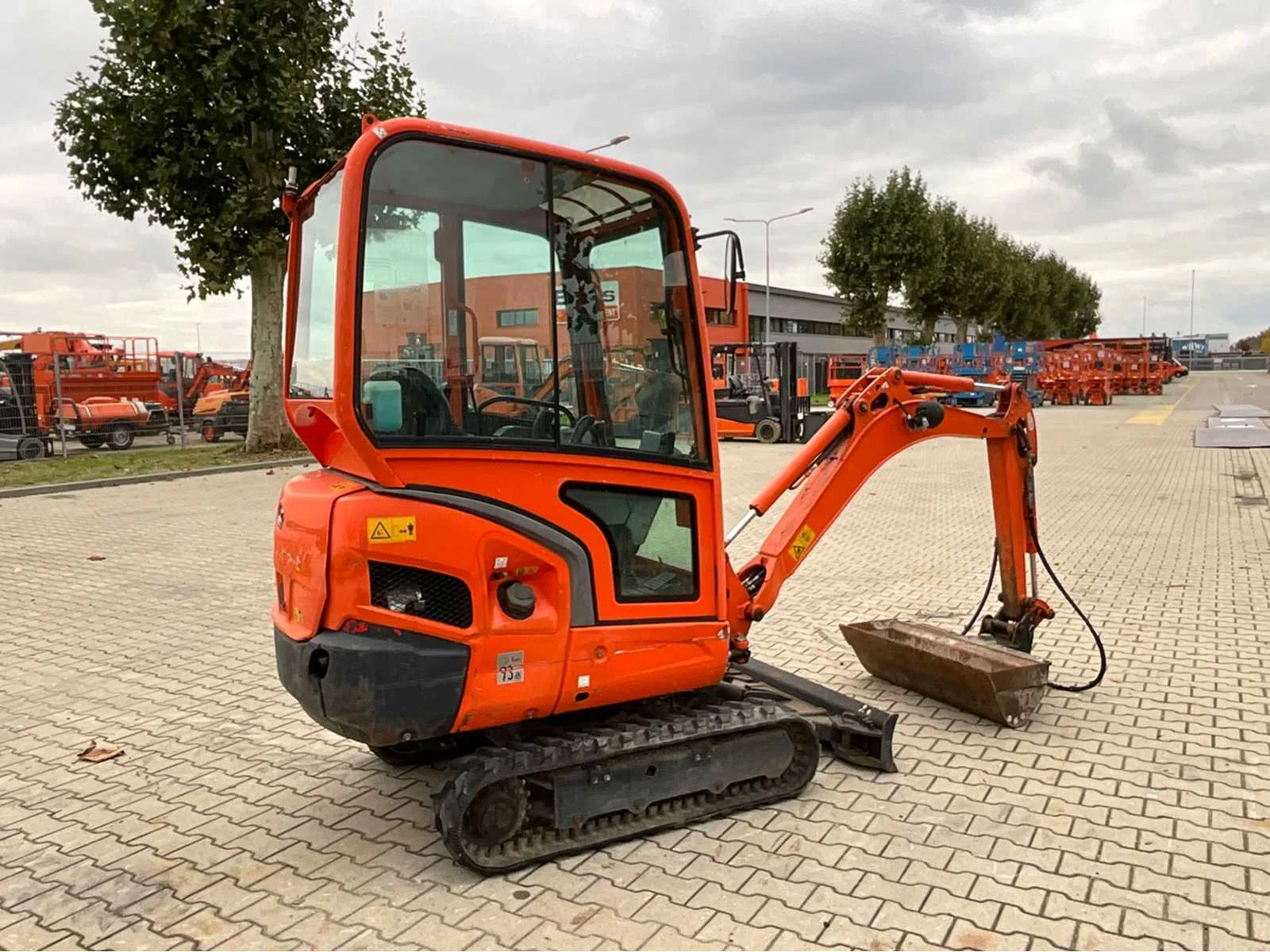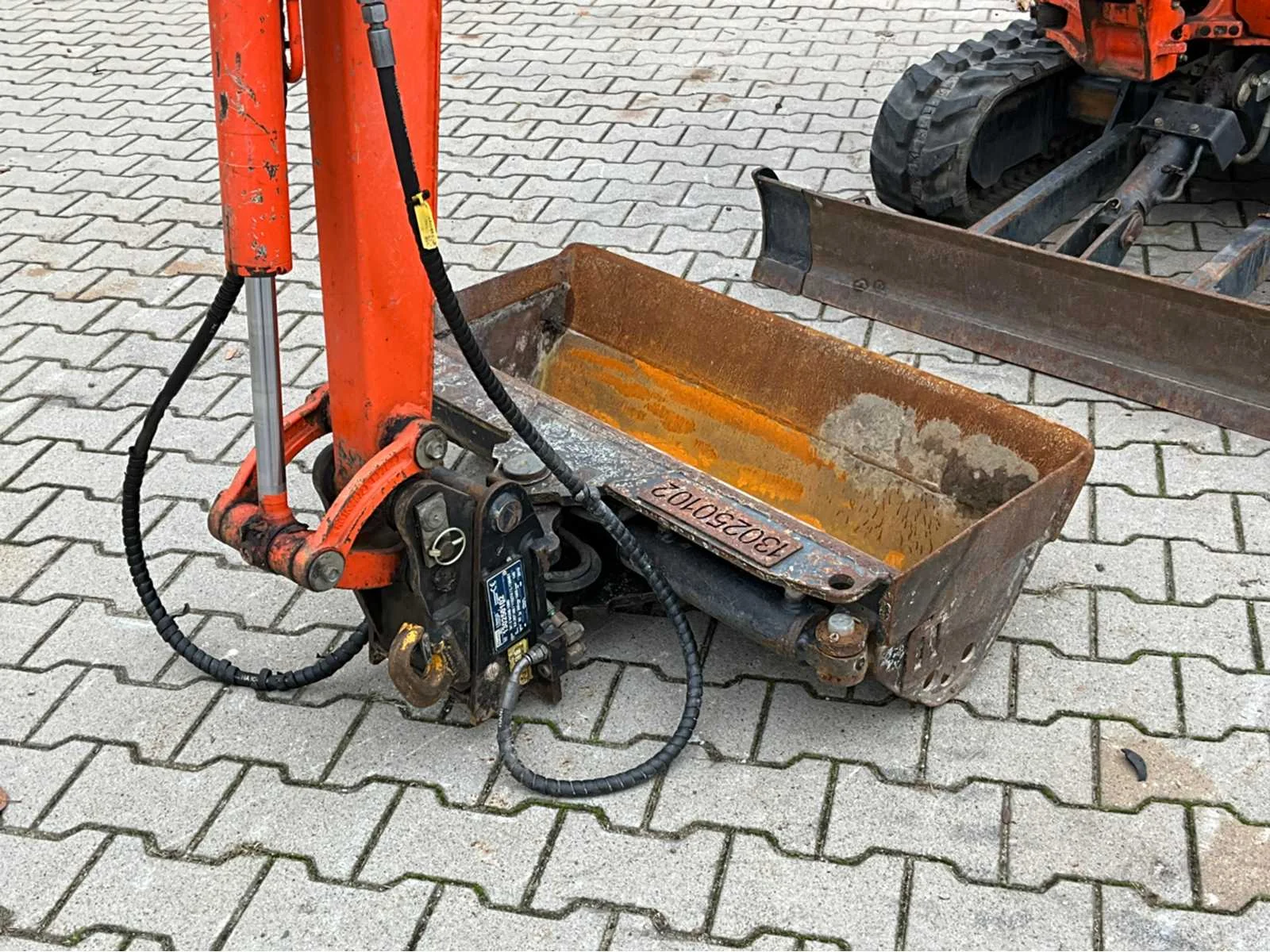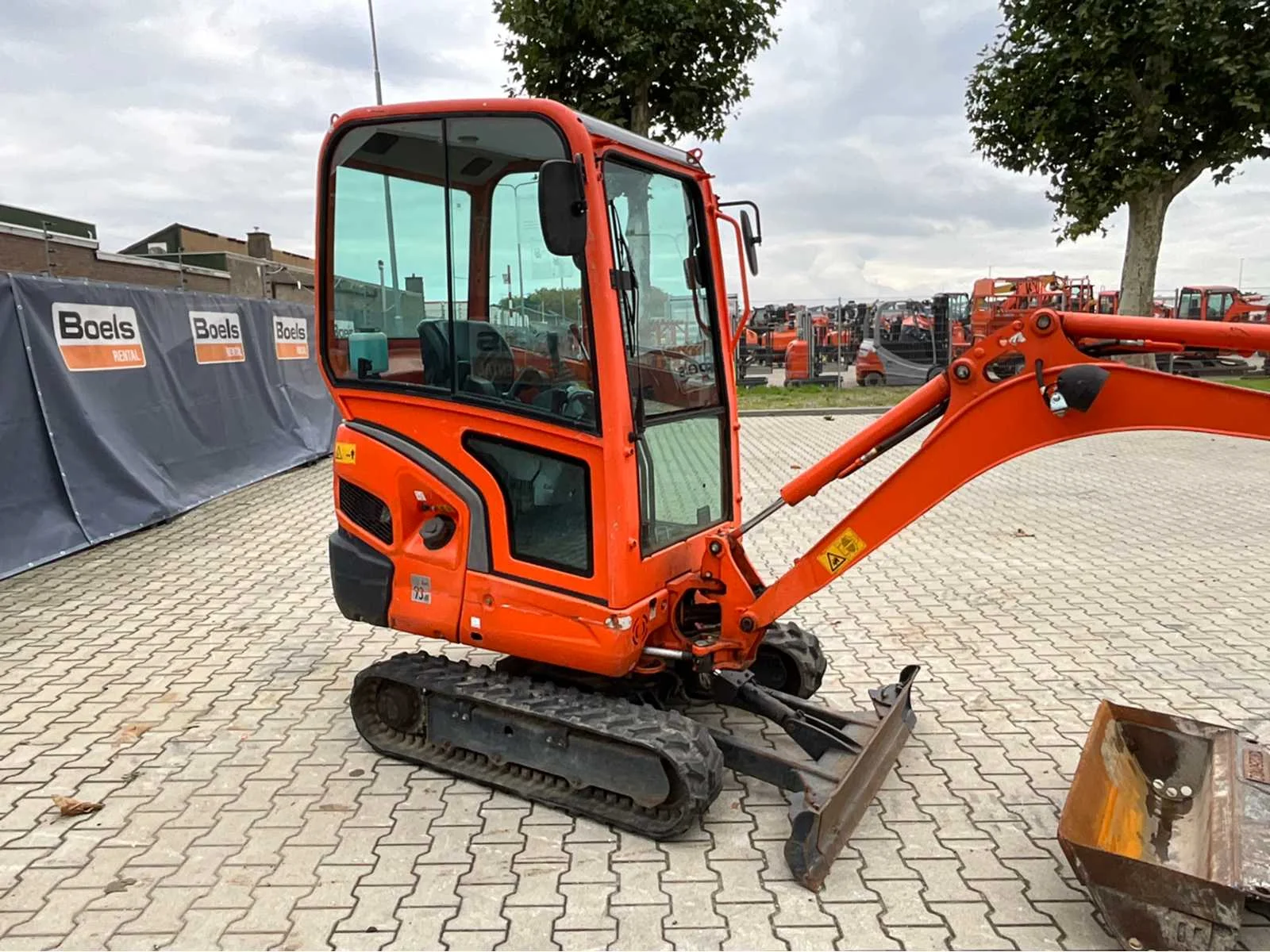 Gesloten cabine; rubber rupsbanden; rupsen hydraulisch in breedte verstelbaar 990 - 1240 mm; maximale uitstorthoogte 2250 mm; extra hydraulische functie; snelwissel; dozerblad breedte 1230 mm; zonder identificatie plaatje; working condition; Nee Merk: Kubota Type: KX016-4G Bouwjaar: 2017 Serienummer: WKFRGB1200Z062190 Merk motor: Kubota Motorvermogen (kW): 9.6kW Aantal cilinders: 3 Brandstof: Diesel Max. werkbereik: 3730mm Max. graafdiepte: 2250mm Graafbak afm. l: 350mm Graafbak afm. b: 1000mm Graafbak afm. h: 300mm Rups breedte: 230mm Afgelezen urenstand: 1828 Eigen gewicht: 1625kg Totale afmeting L: 3750mm Totale afmeting Breedte: 1250mm Totale afmeting Hoogte: 2350mm