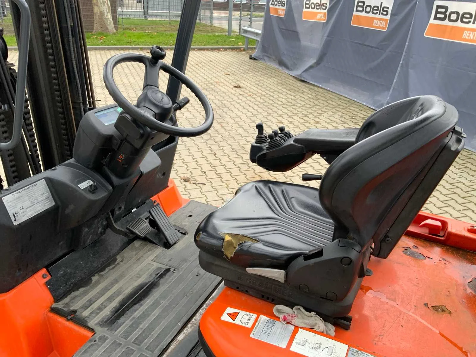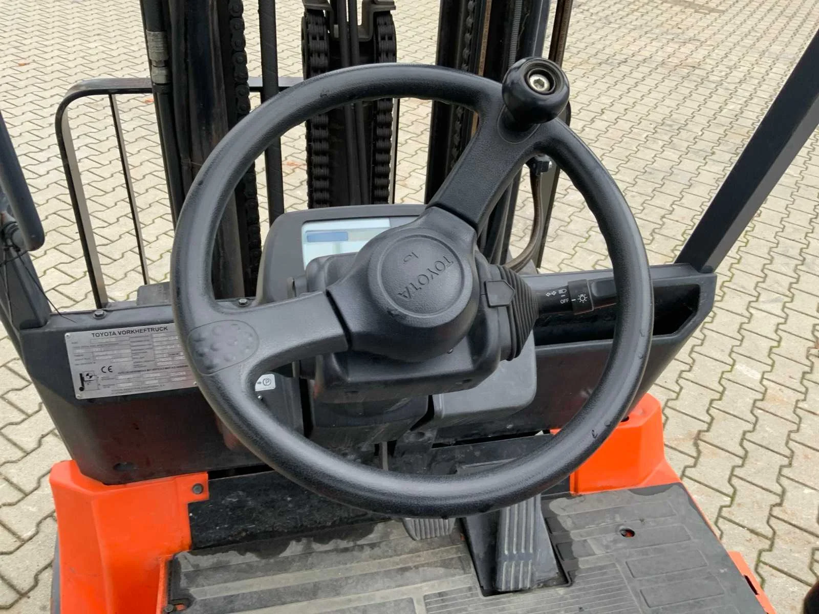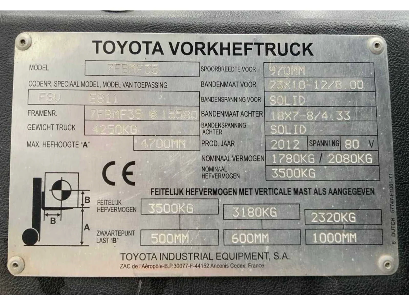 Vorkbreedte125 mm; working condition; Nee Merk: Toyota Type: 7FBMF35 Bouwjaar: 2012 Serienummer: 7FBMF3515580 Brandstof: Elektrisch Aantal wielen: 4 Afgelezen urenstand: 2189 Free-lift: true Side-shift: true Triple mast: true Hefvermogen: 3500kg Lepellengte: 1200mm Max. hefhoogte: 4700mm Vol rubber banden: true Minimale doorrijhoogte: 2500mm