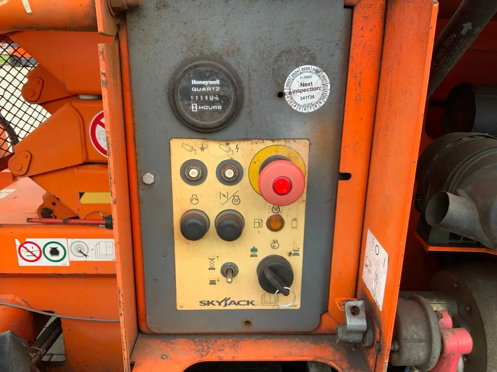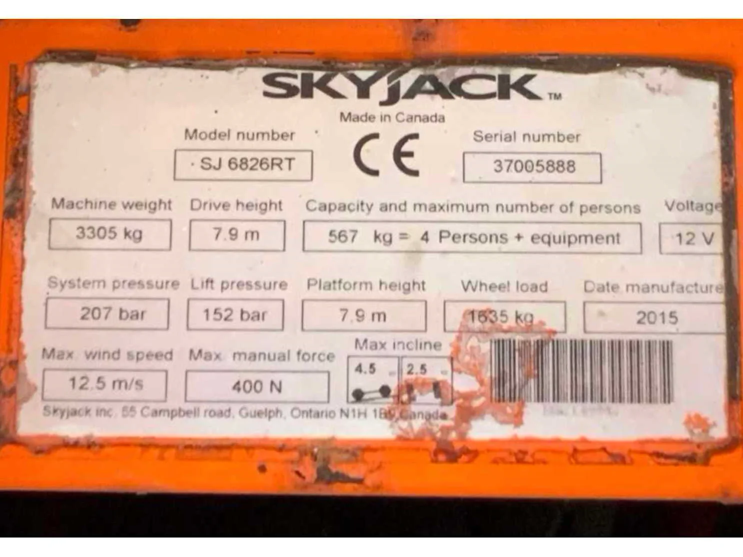 Gebruik; buiten; ruwterrein; 4x4 aandrijving; platform vloerhoogte 7920 mm; uitschuifbaar platform afmeting 3960x1440 mm; 230 Volt stroom aansluiting platform; kooibediening; transporthoogte 1650 mm; working condition; Nee Merk: SkyJack Type: SJ 6826RT Bouwjaar: 2015 Serienummer: 37005888 Diesel: true Schaarhoogwerker: true Werkhoogte: 9920mm Plateau afm. l: 2440mm Plateau afm. b: 1420mm Platform capaciteit: 430kg Afgelezen urenstand: 1721 Eigen gewicht: 3500kg Totale afmeting L: 2750mm Totale afmeting Breedte: 1760mm Totale afmeting Hoogte: 2400mm