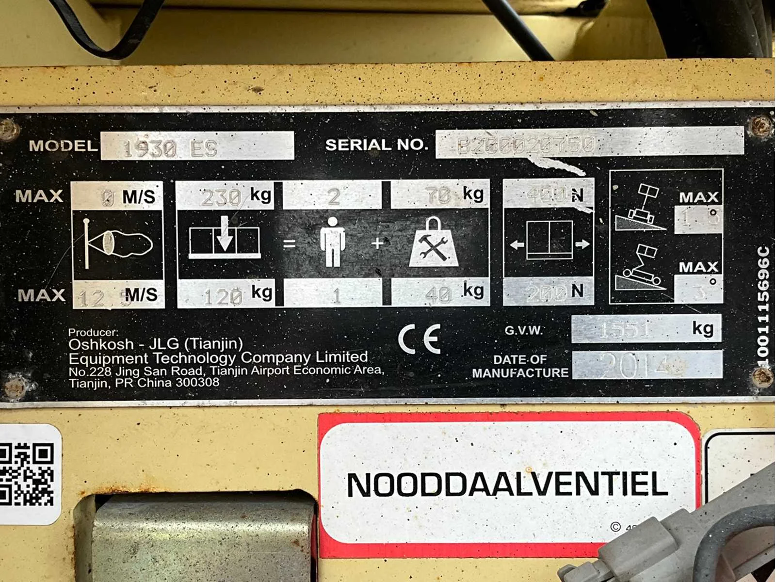 Gebruik: binnen en buiten; platform vloerhoogte 5700 mm; uitschuifbaar platform afmeting circa 2750x750 mm; interne acculader 230 Volt; kooibediening; transporthoogte circa 1750 mm; accu pakket aan vervanging toe; working condition; Nee Merk: JLG Type: 1930ES Bouwjaar: 2014 Serienummer: B200020750 Elektrisch: true Schaarhoogwerker: true Werkhoogte: 7700mm Plateau afm. l: 1850mm Plateau afm. b: 750mm Platform capaciteit: 230kg Afgelezen urenstand: 425 Eigen gewicht: 1565kg Totale afmeting L: 1900mm Totale afmeting Breedte: 800mm Totale afmeting Hoogte: 2050mm