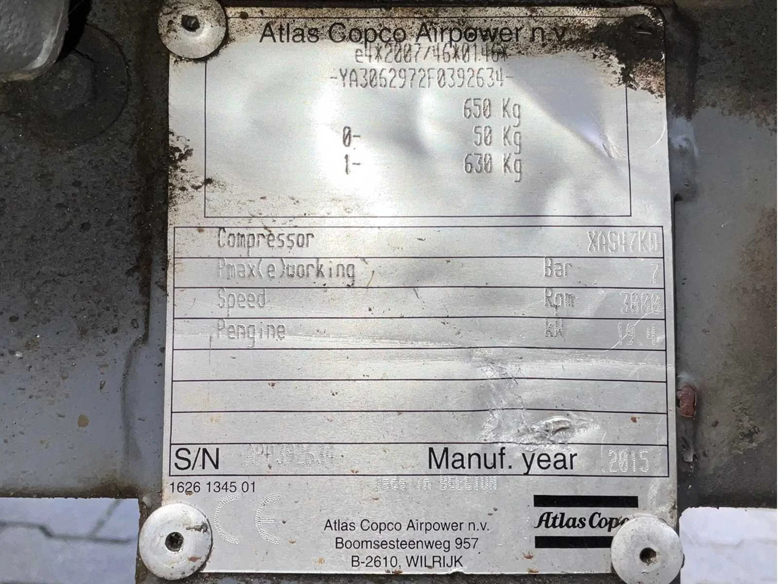 Chassisnummer YA3062972F0392634; afgelezen urenstand 1367 uur; Kubota 3 cilinder dieselmotor; werkdruk 7 bar; kunststof kap; opklapbare trekboom; neussteun; working condition; (de koper dient bij transport over de weg zelf te voorzien in een geldig kenteken; een 7 of 9 polige aansluitstekker of verloopstuk met kabel (verlengsnoer kan ter plaatse tegen betaling aangekocht worden); eventueel extra lichtbalk); zonder kentekenpapieren; zonder gelijkvormigheidsattest; Nee Merk: Atlas Copco Type: XAS47KD Bouwjaar: 2015 Serienummer: APP392634 Luchtstroom: 2400l/min Vermogen: 19.4kW Afgelezen urenstand: 1367hr Eigen gewicht: 650kg Totale afmeting L: 3200mm Totale afmeting Breedte: 1350mm Totale afmeting Hoogte: 1300mm
