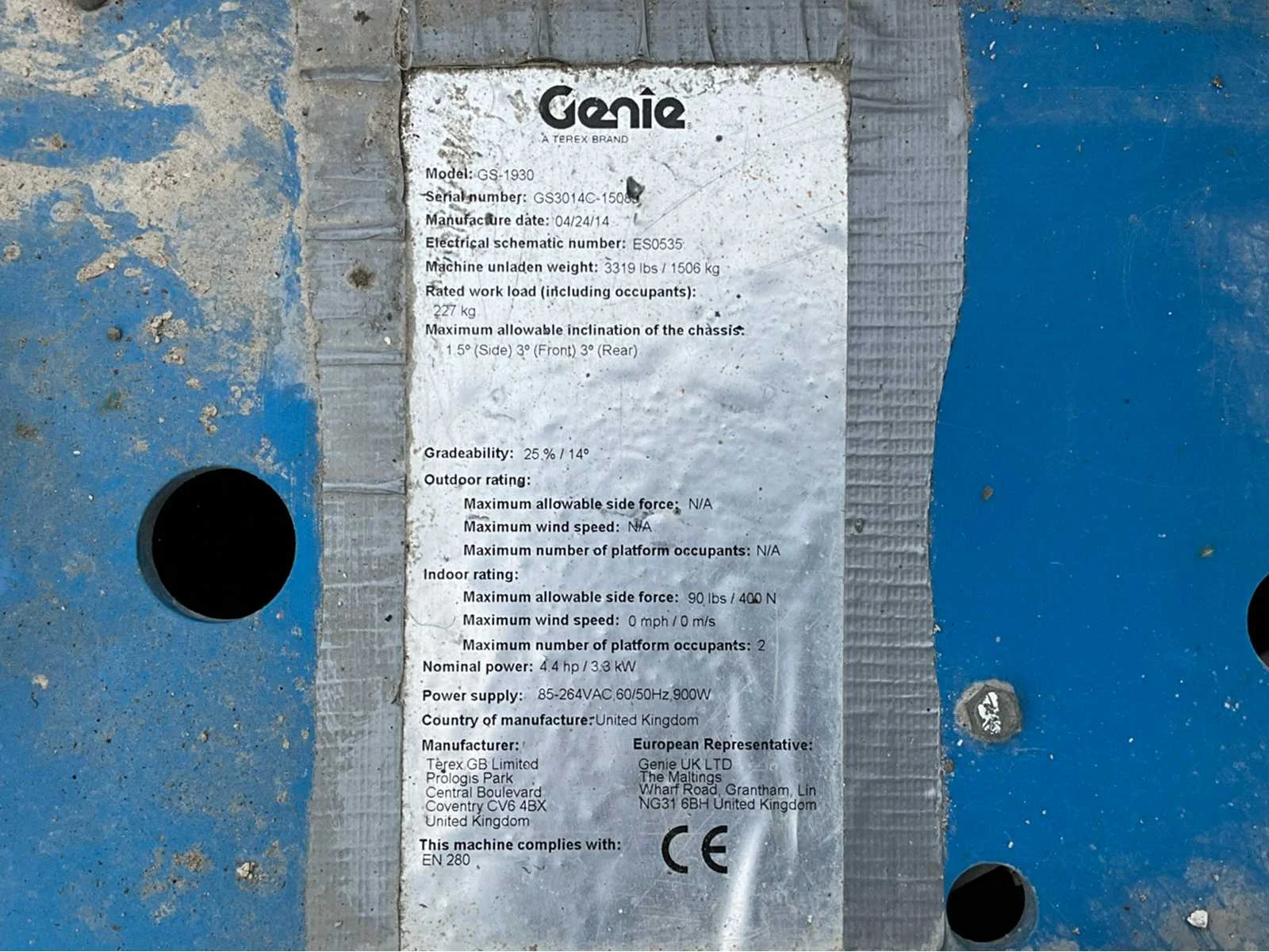 Platform vloerhoogte 5800 mm; uitschuifbaar platform afmeting circa 2540x600 mm; interne acculader 230 Volt; kooibediening; transporthoogte circa 1750 mm; working condition; Nee Merk: Genie Type: GS1930 Bouwjaar: 2014 Serienummer: GS3014C-15088 Elektrisch: true Schaarhoogwerker: true Werkhoogte: 7800mm Plateau afm. l: 1630mm Plateau afm. b: 750mm Platform capaciteit: 225kg Afgelezen urenstand: 629 Eigen gewicht: 1350kg Totale afmeting L: 1850mm Totale afmeting Breedte: 800mm Totale afmeting Hoogte: 2150mm