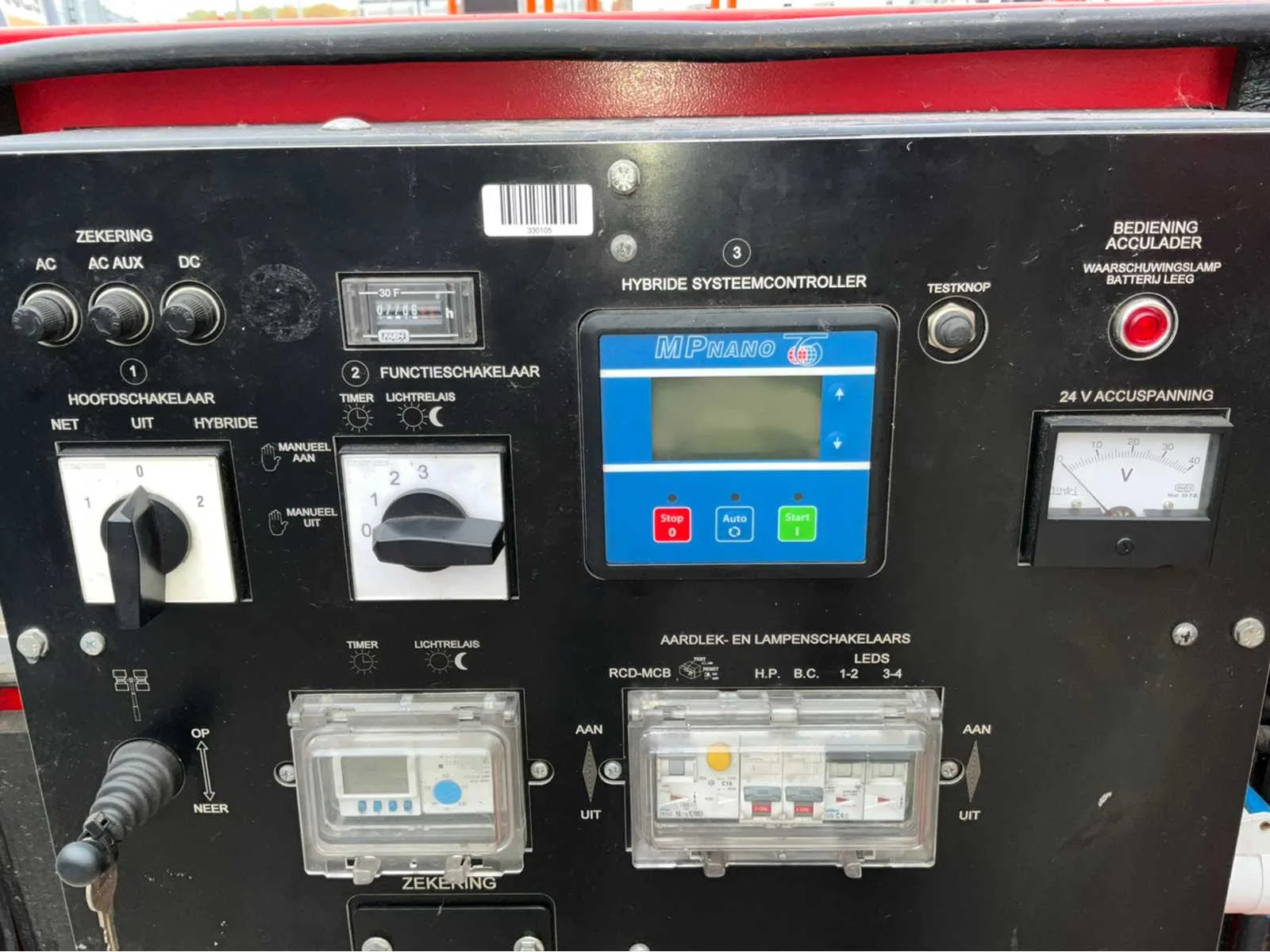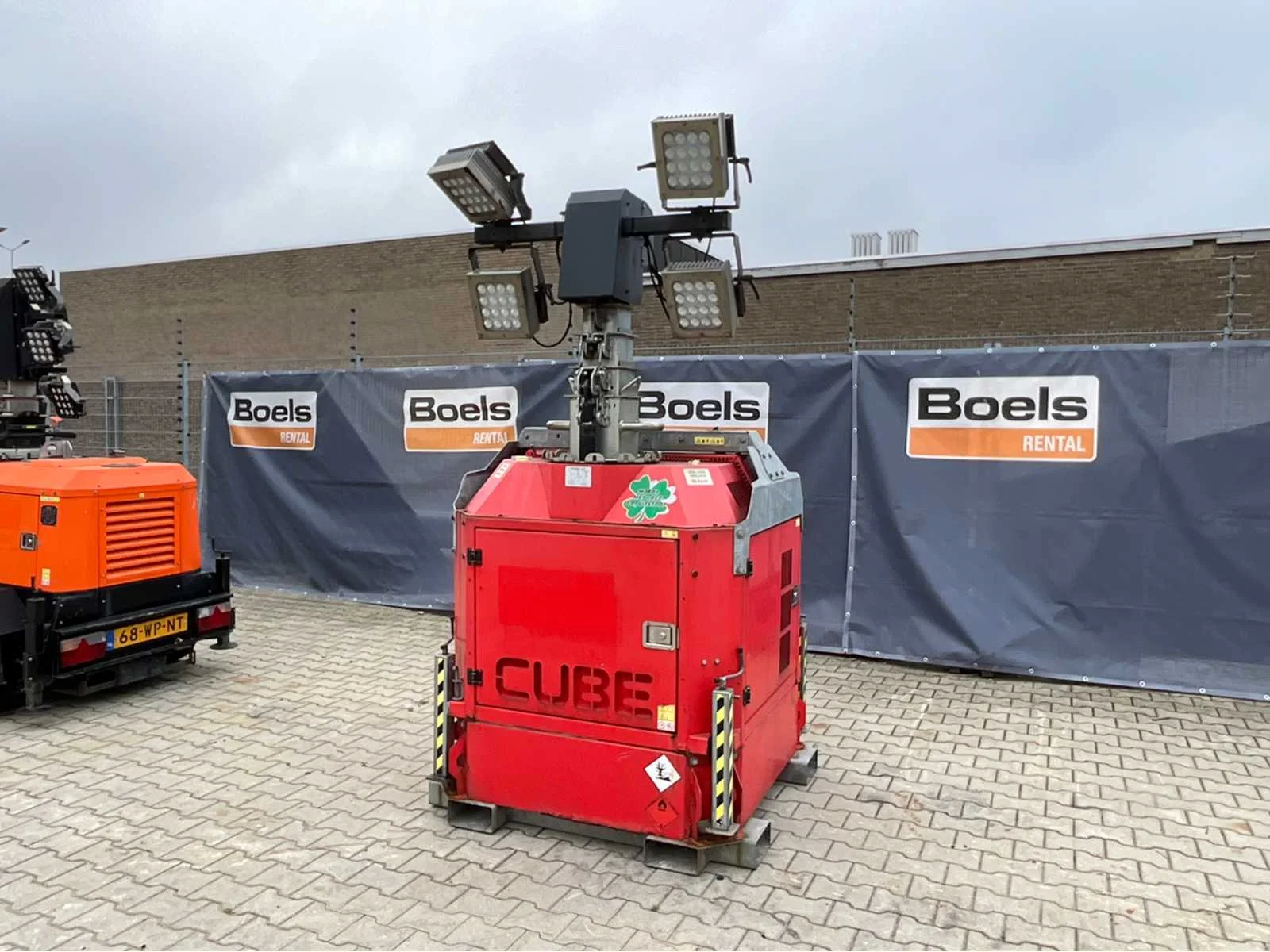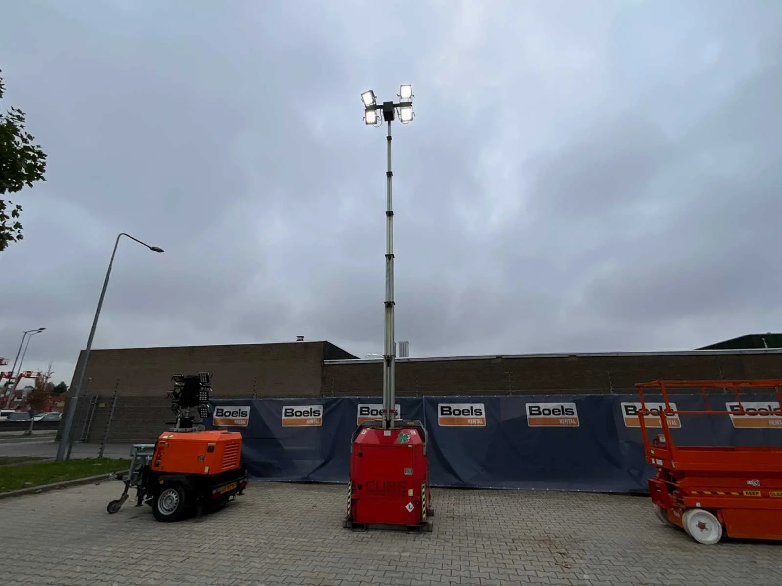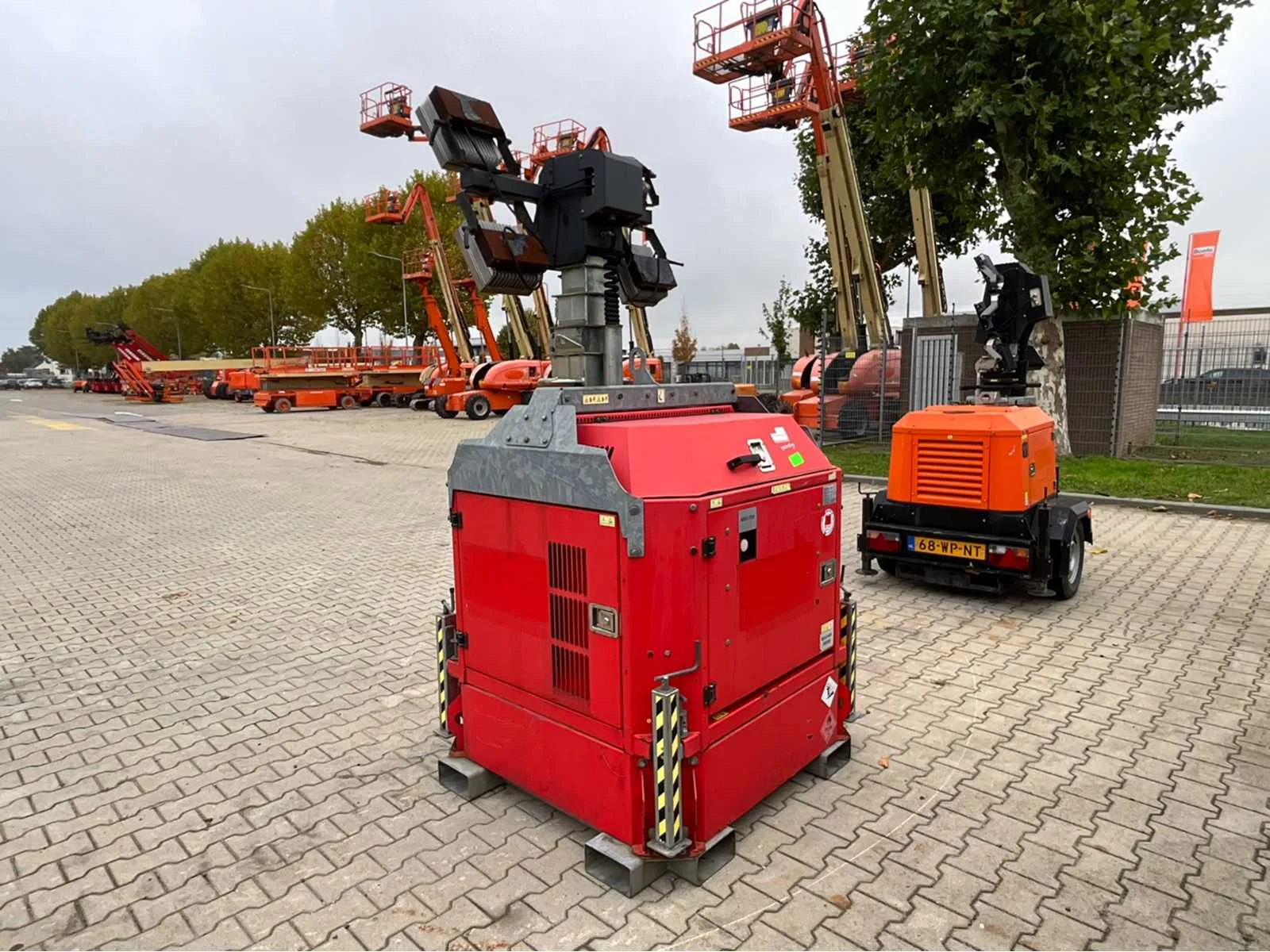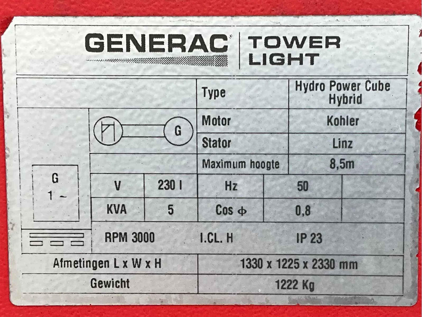 Hydraulische telescoopmast; maximale masthoogte 8,5 meter; Kohler dieselmotor; Linz alternator; lichtsensor; timer; 4x 150 Watt LED lampen; afgelezen urenstand 7708 uur; 4x uitschuifbare stempelvoeten; 230 Volt aansluiting; heftruck vorksleuven; working condition; Nee Merk: Generac Tower Light Type: HPC Hydro Power Cube Hybrid LED Bouwjaar: 2015 Serienummer: 1505897 Eigen gewicht: 1250kg Totale afmeting L: 1300mm Totale afmeting Breedte: 1300mm Totale afmeting Hoogte: 2400mm