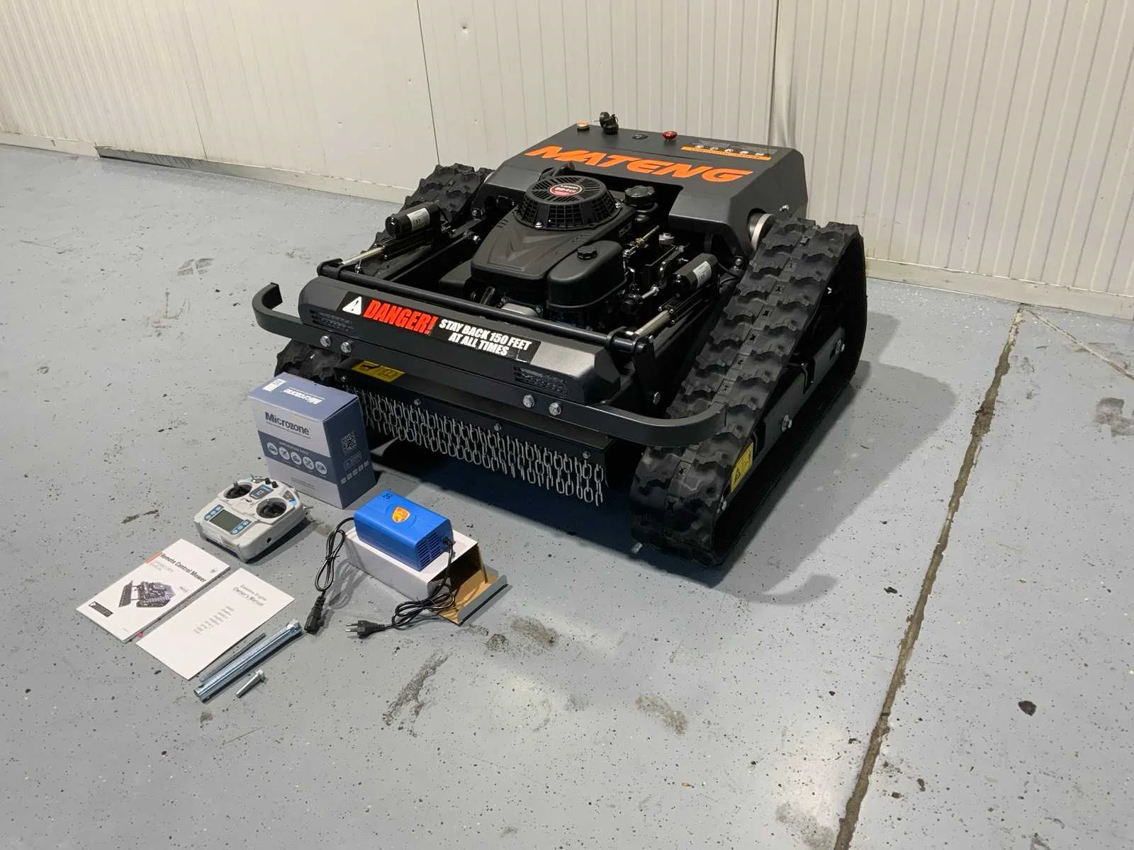 Motor: 224 cc 4-takt benzinemotor, maaibreedte: 53 cm, maximaal bereik: Tot 600 meter afstand bestuurbaar. Brandstoftank: 1 liter, verbruik: ongeveer 0,7 liter per uur. Maximale hellingshoek: tot 45 graden, maximale snelheid: 3 km/u. Maaihoogte: Instelbaar tussen 3 en 12 cm Besturingssysteem: Afstand bediening via draadloze zender, met een bereik tot 600 meter. Ontwerp: Robuust en geschikt voor hellingen tot 45 graden. Gebruiksgemak: Eenvoudige bediening en instelbaarheid voor optimale maairesultaten. Veiligheid: incl. noodstop en obstakeldetectie voor veilig gebruik op steile hellingen. Een krachtige 224 cc 4-takt motor en een maaibreedte van 53 cm. Nee Merk: Mateng Type: RM20 Bouwjaar: 2025 Werkbreedte: 53cm Zelfrijdend: true Benzinemotor: true Brandstof: benzine Elektrisch aangedreven: true Eigen gewicht: 152kg Totale afmeting L: 100cm Totale afmeting Breedte: 100cm Totale afmeting Hoogte: 48cm