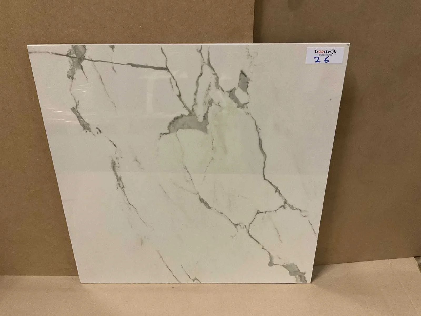 2 pallets Nee Merk: Kutahya Kleur: Albatros Afwerking: Gepolijst Lengte: 600mm Breedte: 600mm Dikte: 9mm Materiaal: Keramiek Type: Vloertegel Aantal m² per verpakking: 1.8m² Aantal pakken: 30 Totaal oppervlakte: 54m² Totaal gewicht: 1080kg