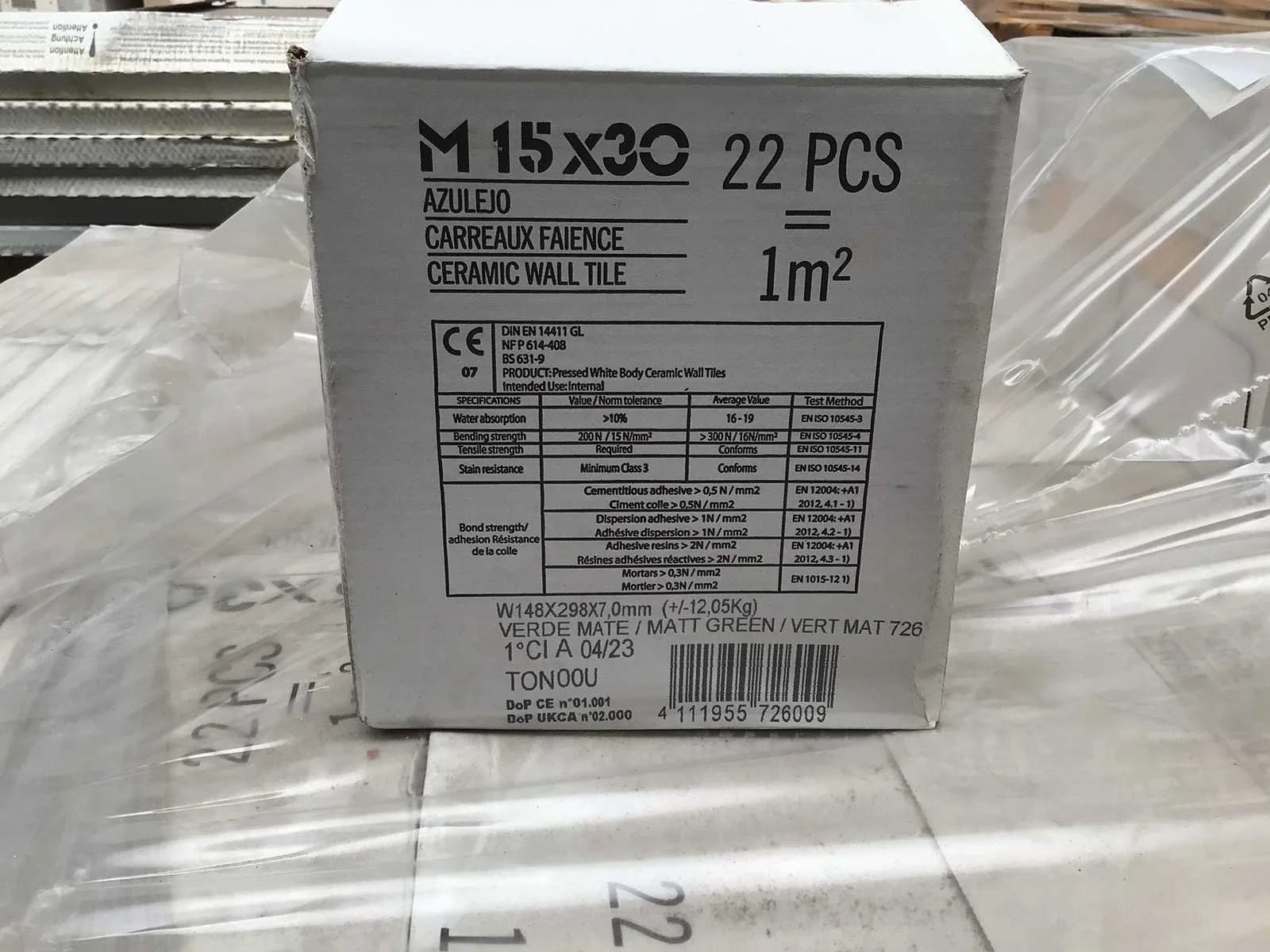 Nee Merk: Ceragni Kleur: Green Afwerking: Mat Lengte: 15cm Breedte: 30cm Materiaal: Keramiek Dikte: 7mm Type: Wandtegel Model: Plain 32140 Gewicht: 600kg Aantal m² per verpakking: 1m² Aantal pakken: 30
