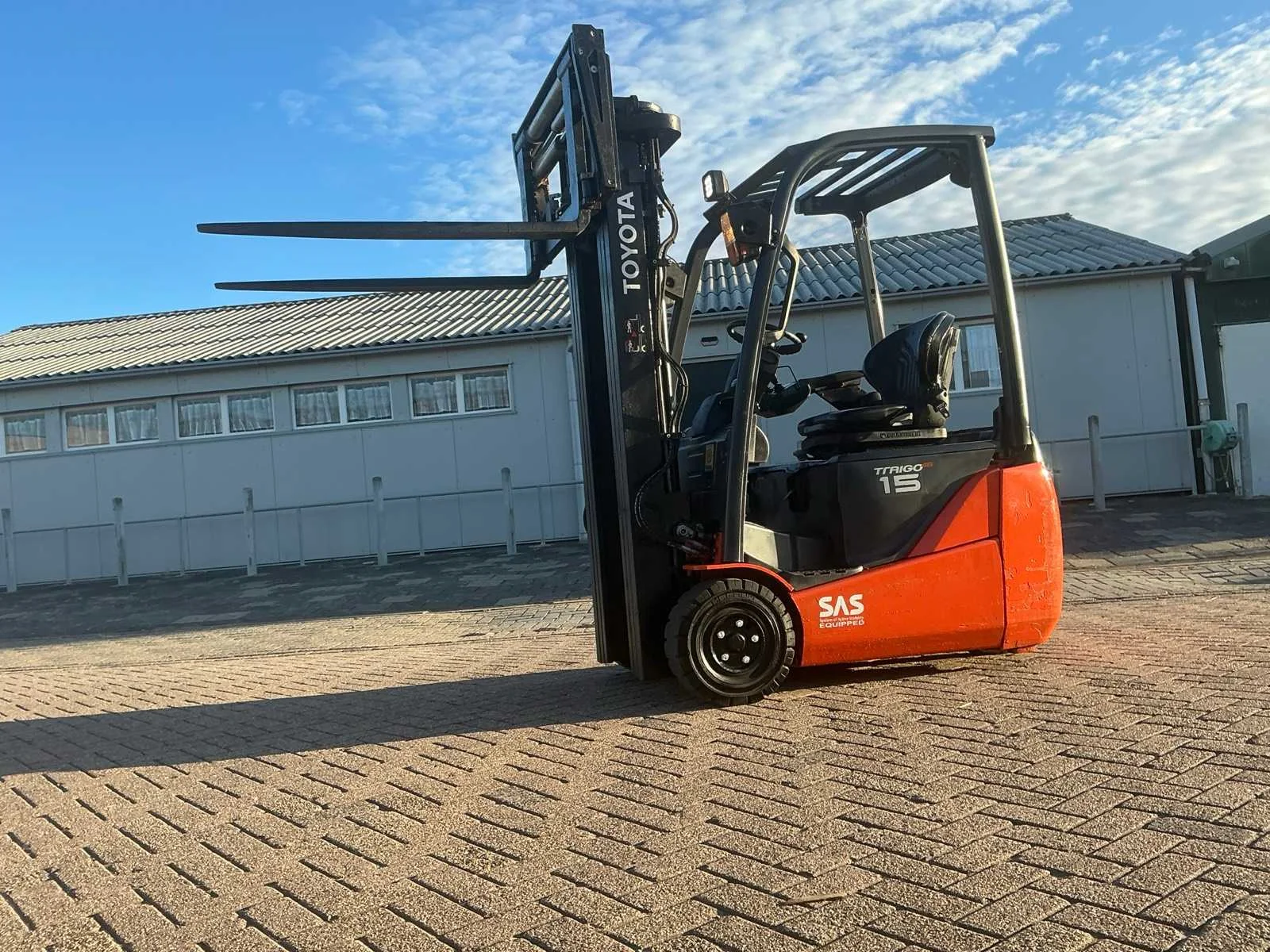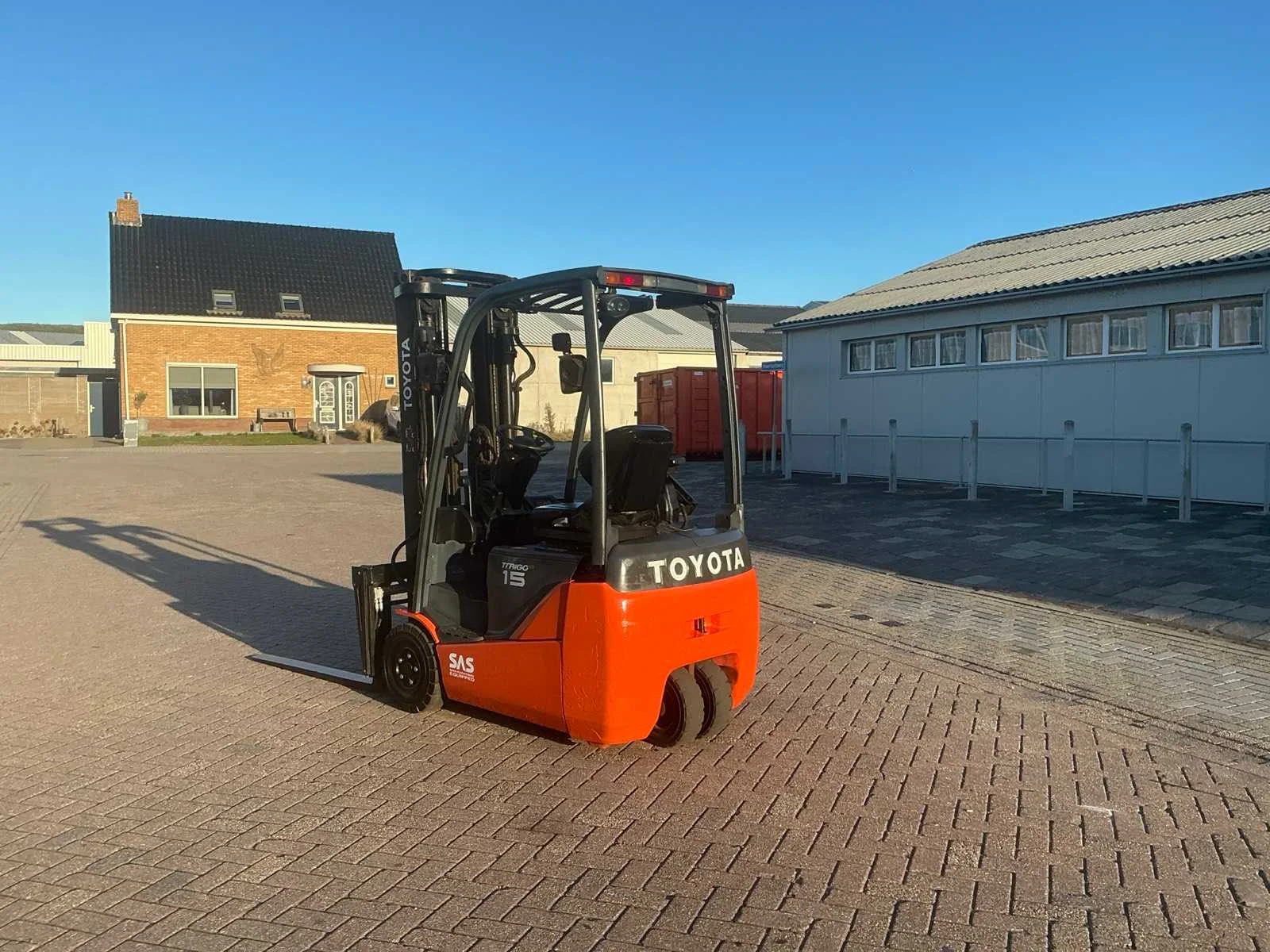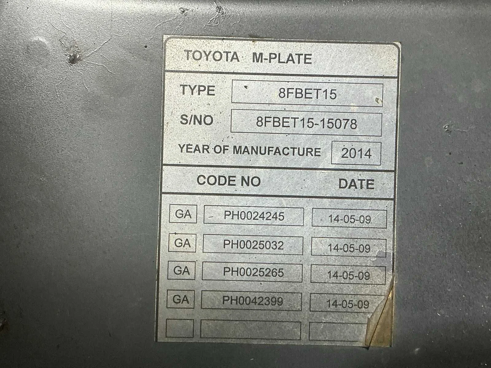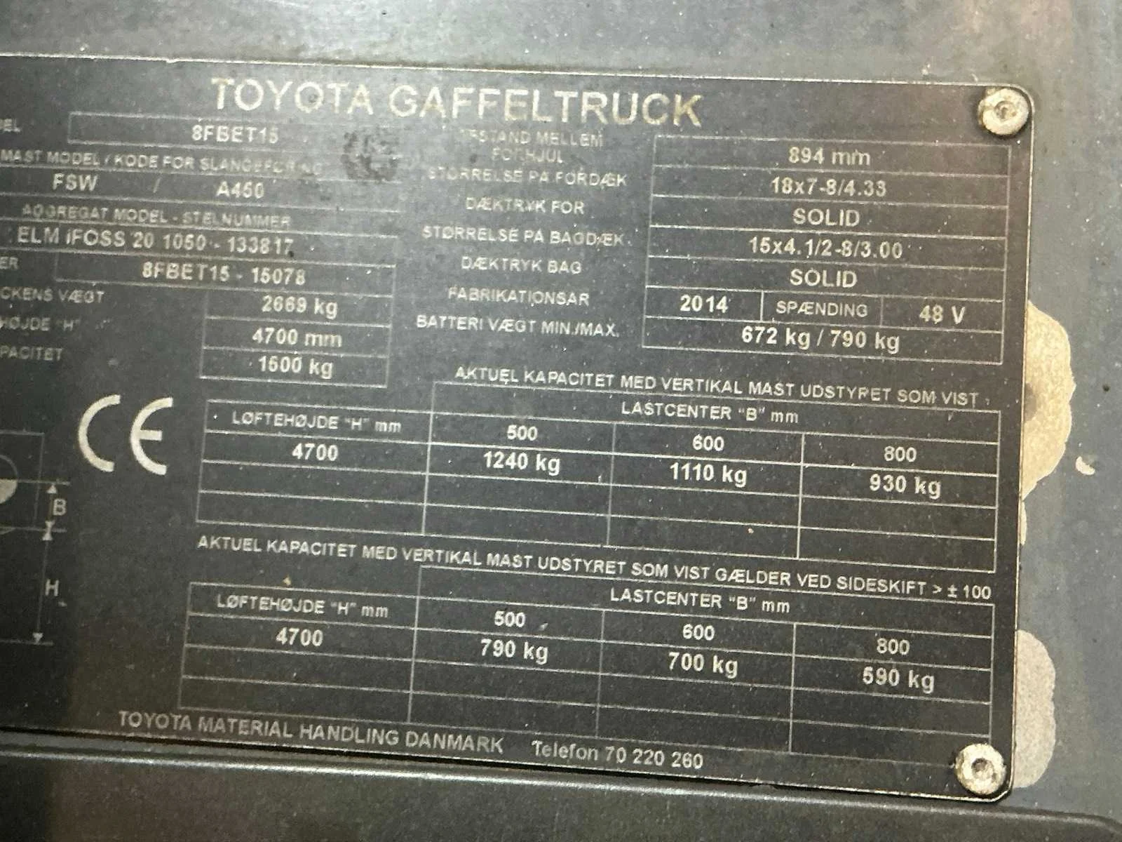 Nee Merk: Toyota Type: 8FBET15 Bouwjaar: 2014 Serienummer: 15078 Brandstof: Elektrisch Mast: Triple Soort band: Volrubber banden Aantal wielen: 3 Free-lift: true Side-shift: true Hydraulisch verstelbare lepels: true Triple mast: true Eigen gewicht: 3310kg Hefvermogen: 1500kg Lepellengte: 1200mm Hefhoogte: 4700mm Vol rubber banden: true Totale afmeting L: 1850mm Totale afmeting Breedte: 1050mm Totale afmeting Hoogte: 2150mm