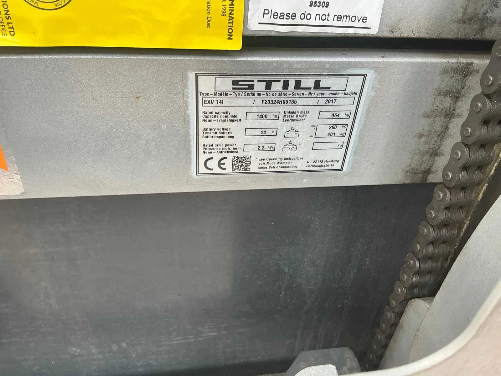 Starttag ontbreekt Nee Merk: Still Type: EXV14L Serienummer: F20324H00135 Lepellengte: 1150mm Afgelezen urenstand: 801 Eigen gewicht: 1224kg Minimale doorrijhoogte: 1900mm Totale afmeting L: 1950mm Totale afmeting Breedte: 800mm
