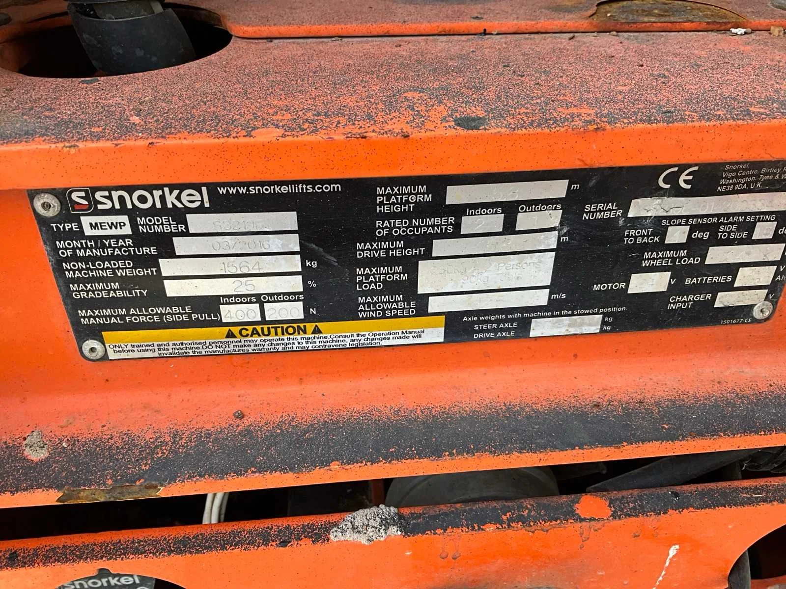 Nee Merk: Snorkel Type: S3219E Bouwjaar: 2016 Serienummer: 200334 Elektrisch: true Schaarhoogwerker: true Werkhoogte: 7800mm Plateau afm. l: 1700mm Plateau afm. b: 800mm Platform capaciteit: 250kg Accu lader: true Eigen gewicht: 1564kg Totale afmeting L: 1800mm Totale afmeting Breedte: 820mm Totale afmeting Hoogte: 2100mm