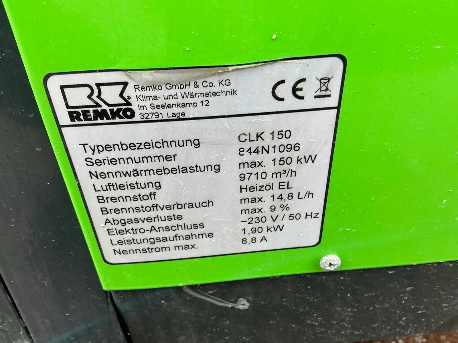 Nee Merk: Remko Type: CLK150 Serienummer: 844N1096 Vermogen: 150kW Ventilator: true Thermostaat: true Totale afmeting L: 2100mm Totale afmeting Breedte: 700mm Totale afmeting Hoogte: 1300mm Aansluiting: 230V