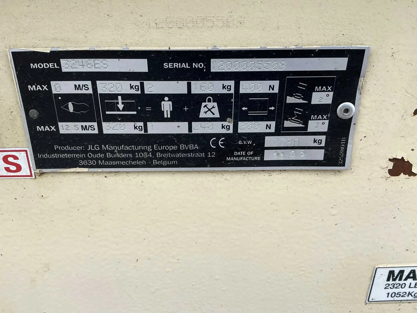 Nee Merk: JLG Type: 3246ES Bouwjaar: 20 Serienummer: 12000005509 Elektrisch: true Schaarhoogwerker: true Werkhoogte: 11700mm Horizontale rijkwijdte: 1270mm Plateau afm. l: 1120mm Plateau afm. b: 2500mm Platform capaciteit: 320kg Accu lader: true Afgelezen urenstand: 882 Eigen gewicht: 2780kg Totale afmeting L: 2500mm Totale afmeting Breedte: 1170mm Totale afmeting Hoogte: 1970mm
