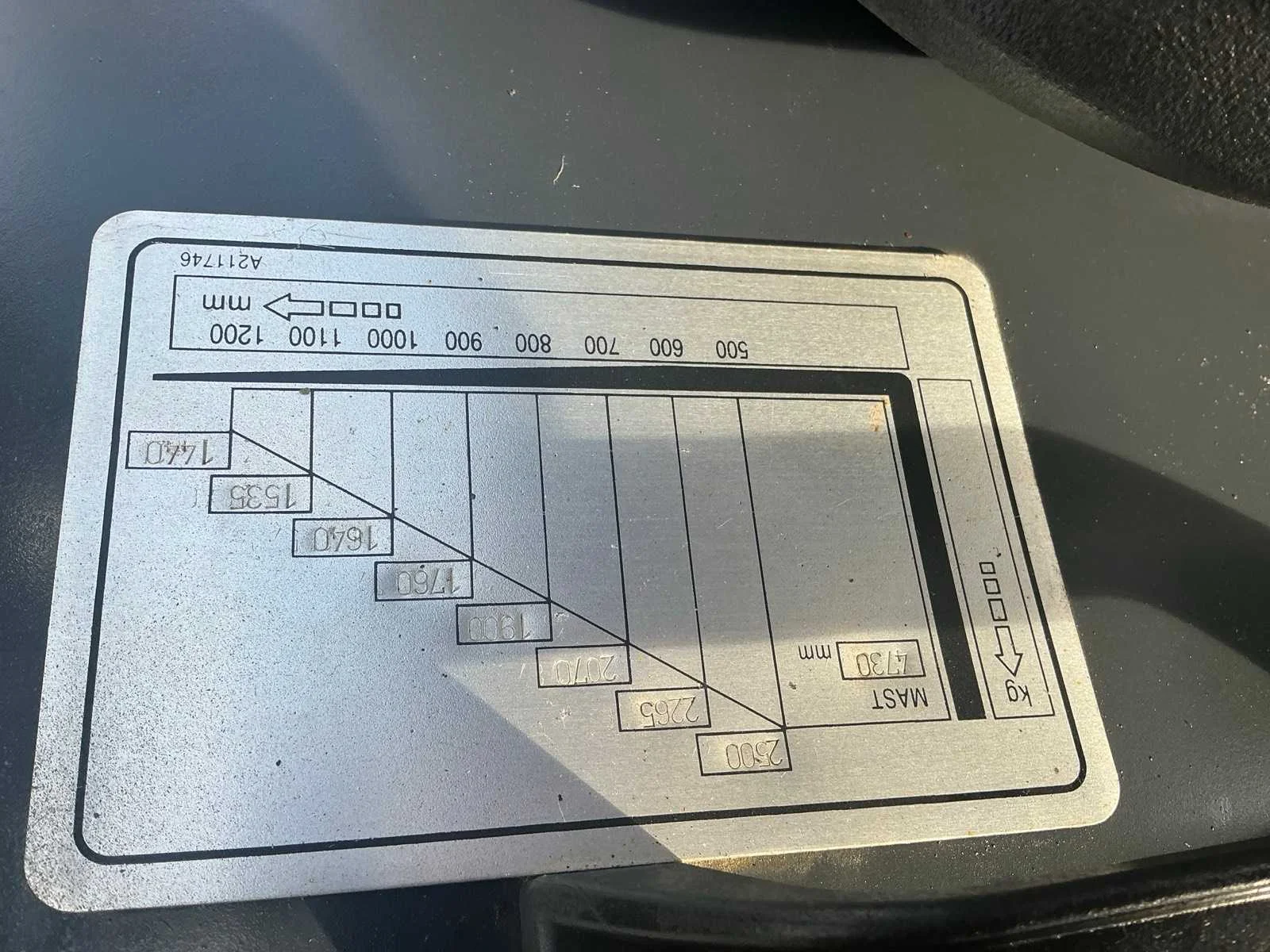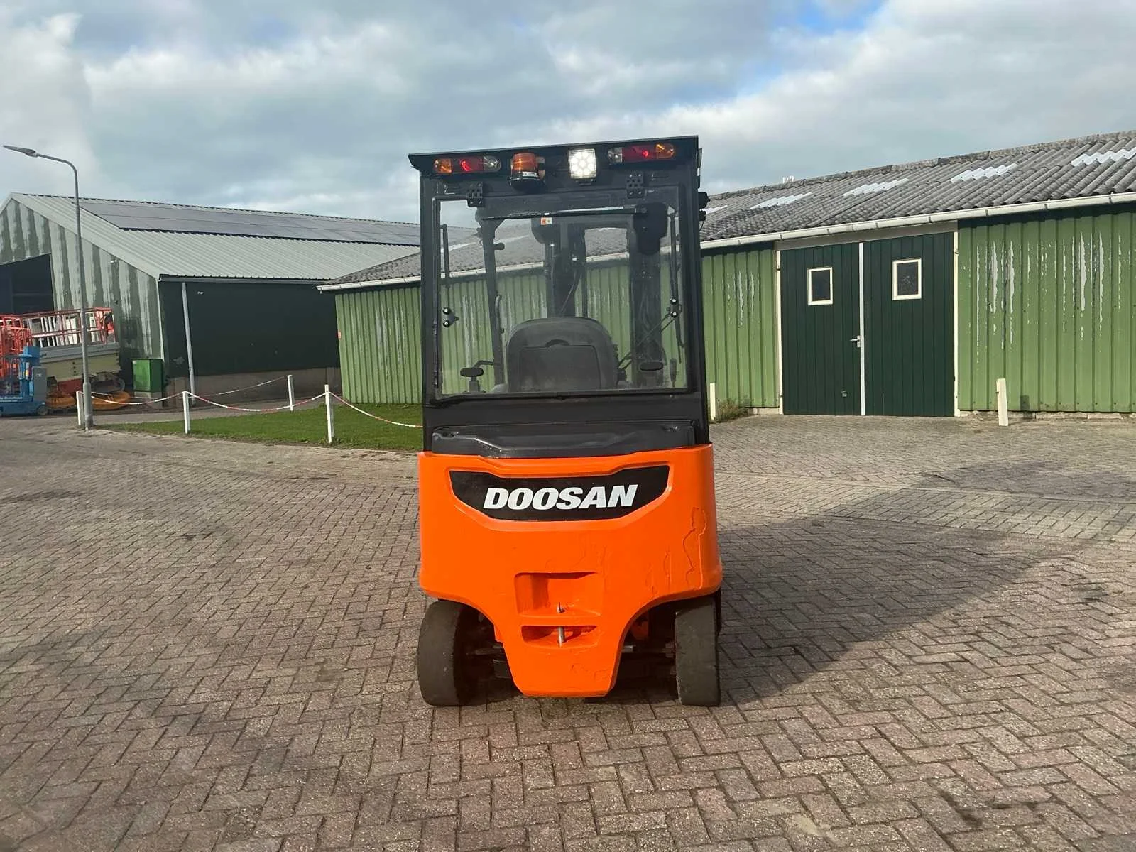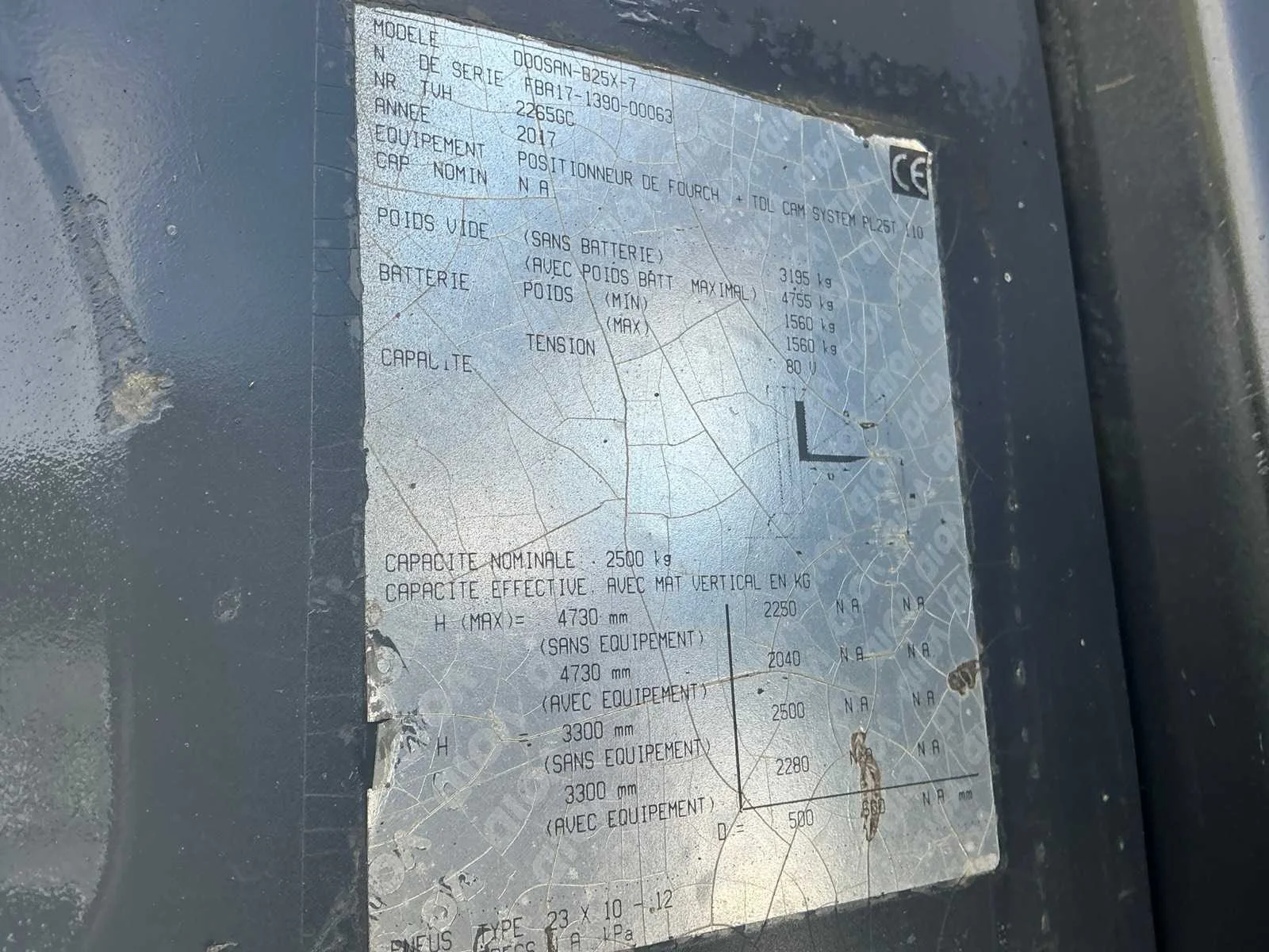 2 extra aansluitingen beschikbaar op vorkenbord; Nee Merk: Doosan Type: B25X-7 Bouwjaar: 2017 Serienummer: 2256GV Brandstof: Elektrisch Mast: Triple Soort band: Volrubber banden Aantal wielen: 4 Afgelezen urenstand: 1198 Free-lift: true Triple mast: true Eigen gewicht: 4755kg Hefvermogen: 2500kg Lepellengte: 1500mm Hefhoogte: 4730mm Vol rubber banden: true Totale afmeting L: 2300mm Totale afmeting Breedte: 1220mm Totale afmeting Hoogte: 2150mm