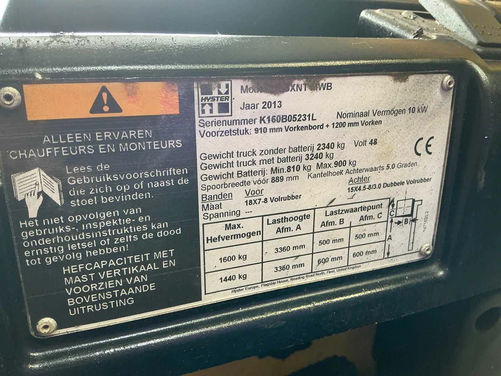 Nee Merk: Hyster Type: J16XNTMWB Bouwjaar: 2013 Serienummer: K160B05231L Brandstof: elektriciteit Mast: Duplex Soort band: Volrubber banden Aantal wielen: 3 Afgelezen urenstand: 3080 Eigen gewicht: 3050kg Hefvermogen: 1600kg Lepellengte: 1200mm Hefhoogte: 3360mm Vol rubber banden: true Minimale doorrijhoogte: 2200mm Totale afmeting L: 1850mm Totale afmeting Breedte: 1050mm Totale afmeting Hoogte: 2200mm