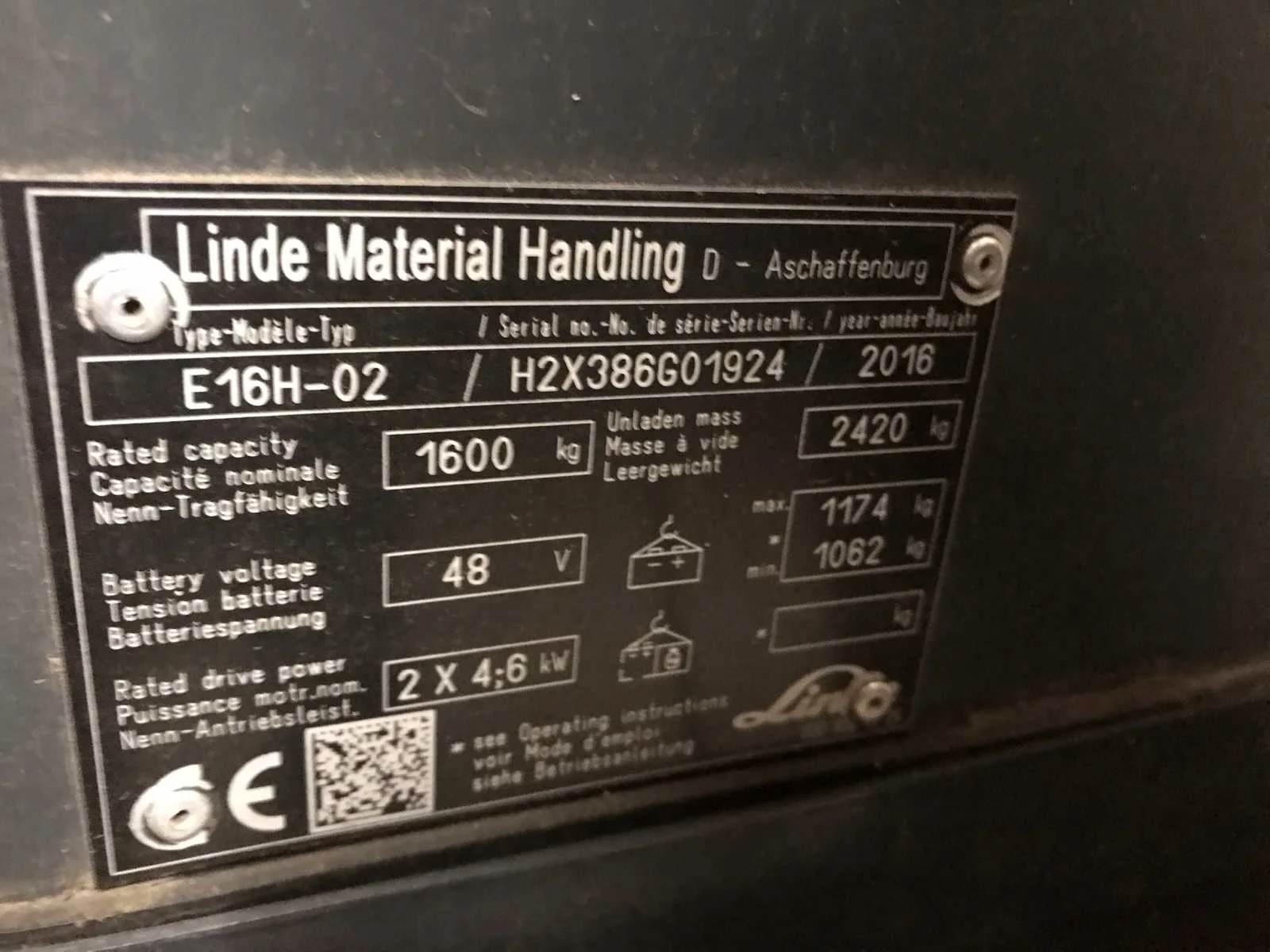 Nee Merk: Linde Type: E16H-02 Bouwjaar: 2016 Serienummer: H2X386G01924 Brandstof: Elektrisch Mast: Duplex Soort band: Volrubber banden Aantal wielen: 3 Afgelezen urenstand: 9443 Side-shift: true Duplex mast: true Eigen gewicht: 3594kg Hefvermogen: 1600kg Lepellengte: 1000mm Vol rubber banden: true Totale afmeting L: 2100mm Totale afmeting Breedte: 1050mm Totale afmeting Hoogte: 2350mm