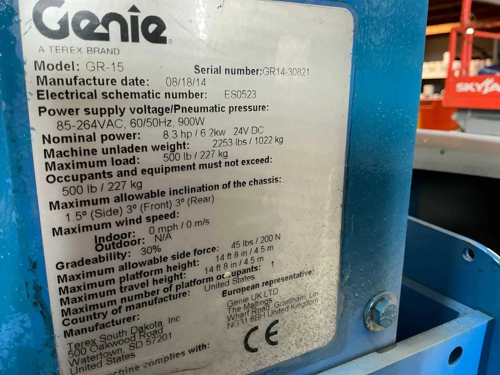 Nee Merk: Genie Type: GR-15 Bouwjaar: 2014 Serienummer: 30821 Telescoop hoogwerker: true Masthoogwerker: true Werkhoogte: 6500mm Horizontale rijkwijdte: 1320mm Plateau afm. l: 750mm Plateau afm. b: 890mm Platform capaciteit: 227kg Accu lader: true Afgelezen urenstand: 17 Eigen gewicht: 1022kg Totale afmeting L: 1350mm Totale afmeting Breedte: 750mm Totale afmeting Hoogte: 1780mm