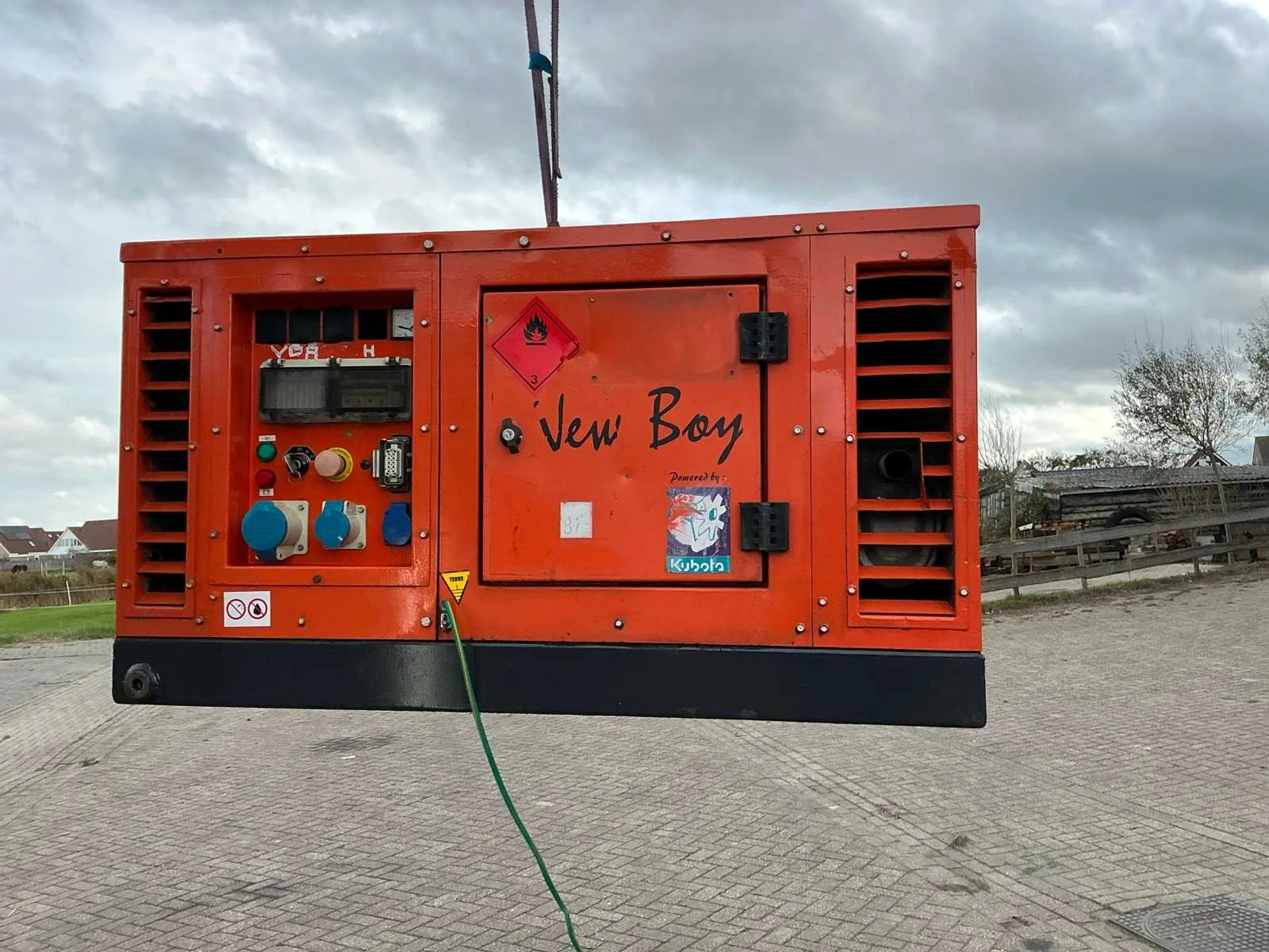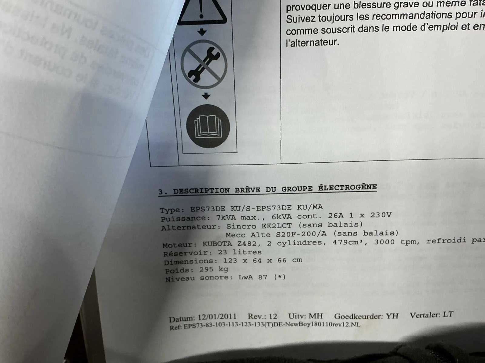 Nee Merk: Kubota Type: EPS73DE Bouwjaar: 2016 Serienummer: 001212-16 Capaciteit.: 7kVA Diesel: true Type motor: Kubota Aantal cilinders: 3 Watergekoeld: true Machinegewicht: 295kg Totale afmeting L: 1230mm Totale afmeting Breedte: 640mm Totale afmeting Hoogte: 660mm